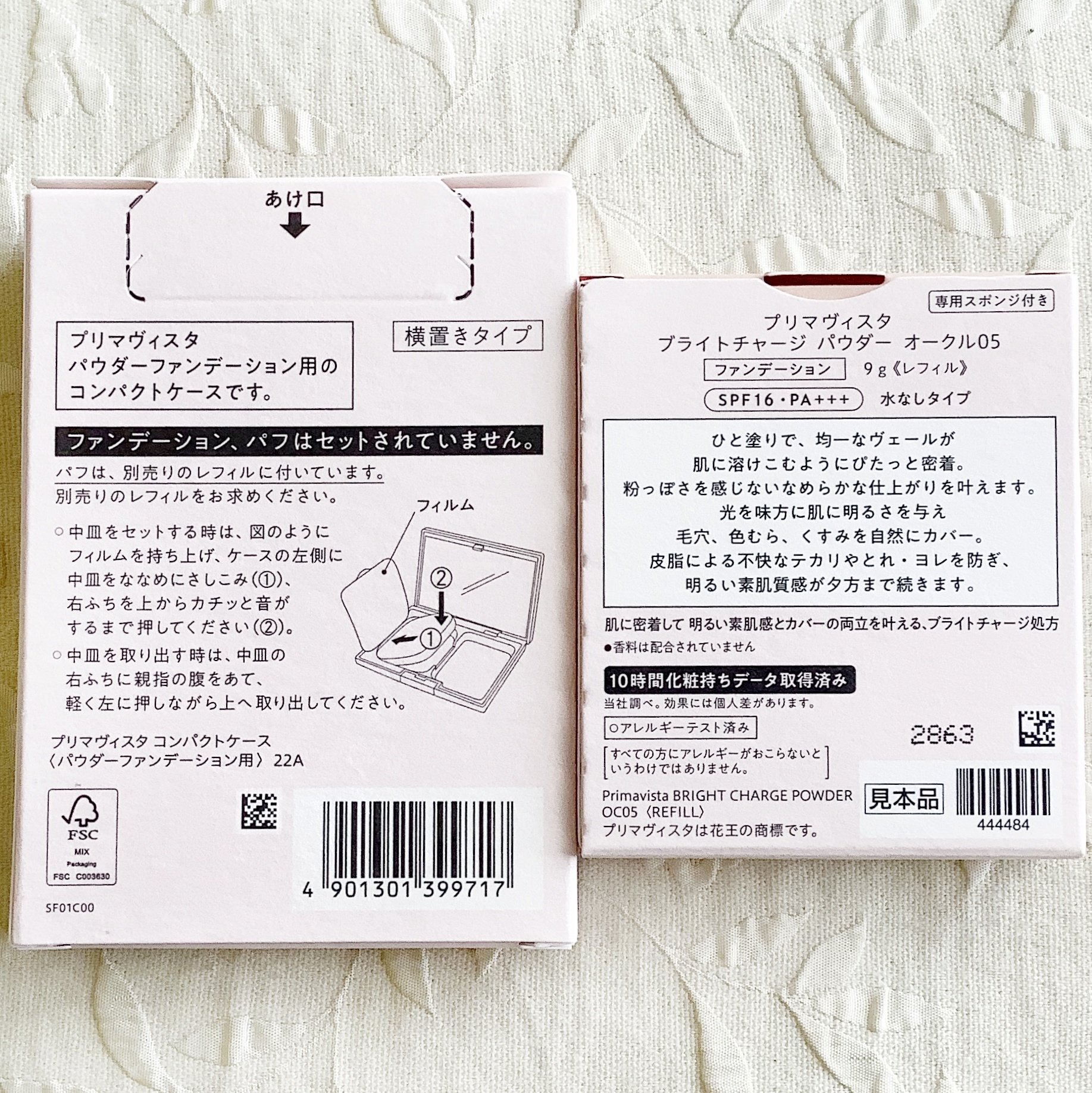 - ※別売りの「プリマヴィスタ パウダーファンデーション ケース」を合わせてご購入の上、ご利用ください。 ひと塗りで、均一なヴェールが肌に溶け込むようにぴたっと密着。 粉っぽさを感じにくいなめらかな仕上がりを叶えます。 光を味方に肌に明るい印象を与え毛穴、色むら、くすみを自然にカバー。 皮脂による不快なテカリやとれ・ヨレを防ぎ、明るい素肌質感が夕方まで続きます。 肌に密着して明るい素肌質感とカバーの両立を叶えるブライトチャージ処方 10時間化粧もちデータ取得済み(当社調べ。効果には個人差があります。) SPF16・PA+++ ● 香料は配合されていません 〇 アレルギーテスト済み(すべての方にアレルギーがおこらないというわけではありません。) スポンジ別売り <セット内容> ・プリマヴィスタ ブライトチャージ パウダー オークル03/オークル05 レフィル 9g ○スポンジはレフィルに付いてます。 ・プリマヴィスタ コンパクトケース〈パウダーファンデーション用〉 ・プリマヴィスタファンデブースト 皮脂くずれ防止ミニサイズ 5ml ミニサイズ