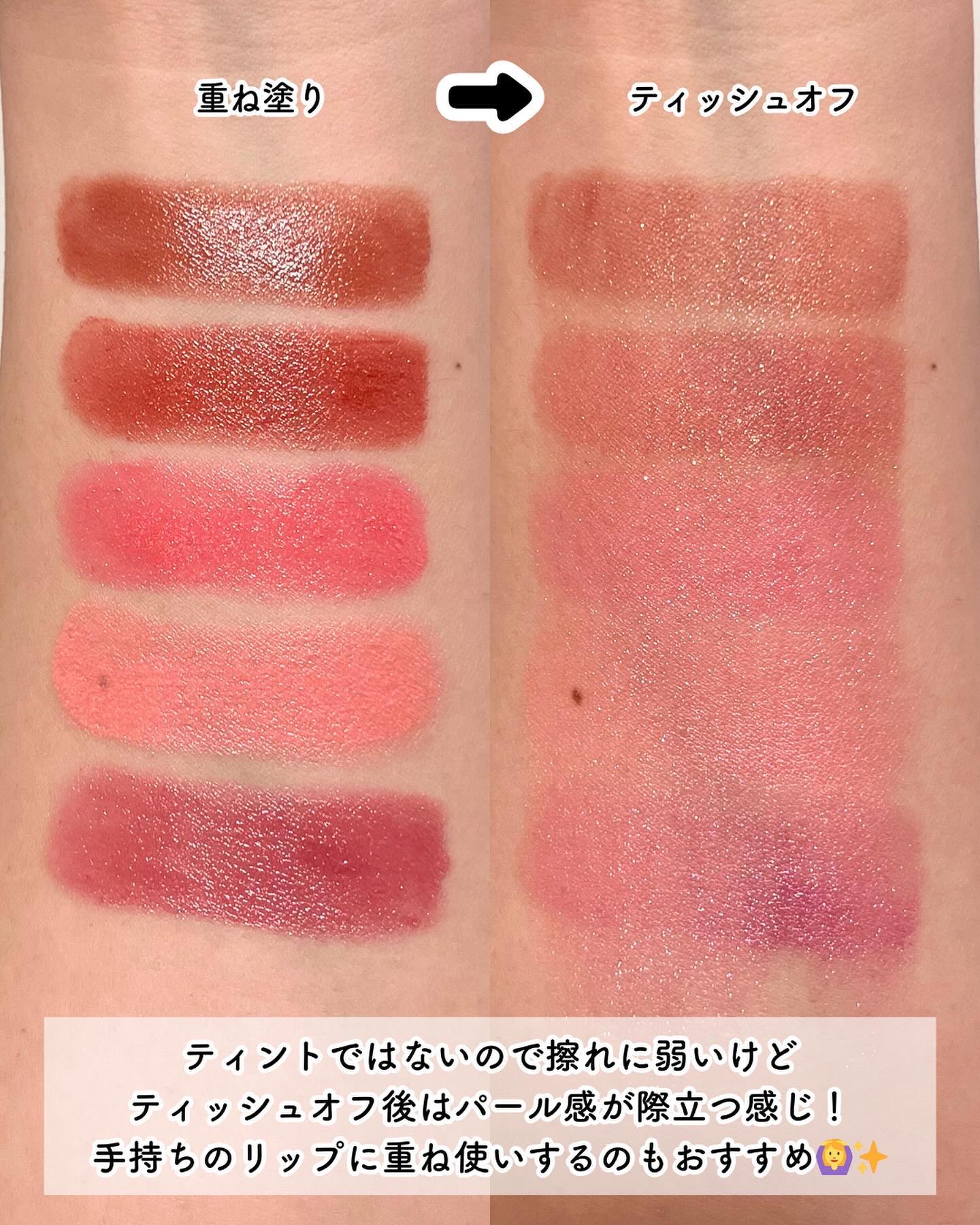 | 口紅・グロス・リップライナーランキング第165位 | 溶けるとオイルっぽいテクスチャーなのですが しっとり感がある割にサラッとしていて ベタつかないので使いやすい! | 詳細を見る | ||