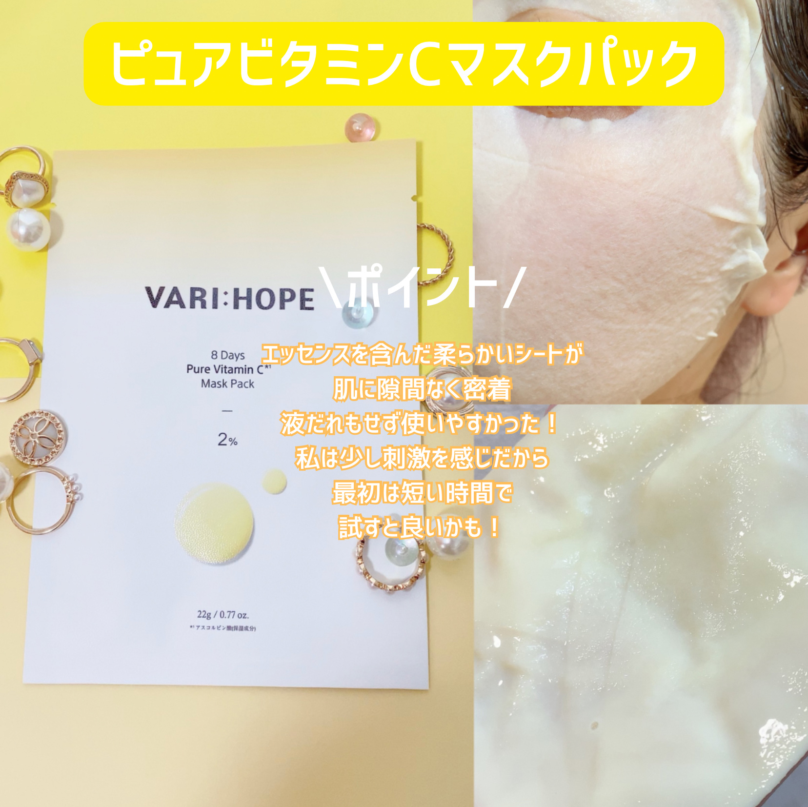 VARIHOPE(@varihope_jp )の白玉セットをお試しさせて頂きました💕 #8デイズピュアビタミンc美容液 #8デイズピュアビタミンcクリーム #8デイズピュアビタミンcマスクパック (5枚入) のセットに、ポーチ、洗顔がおまけでついてくるよ!!お得すぎる!! 水ベースのピュアビタミンC*1配合の美容液。トロッとしたテクスチャーだけど伸びも良くて浸透も早かった!!韓国で累計200万本以上累計販売のある人気美容液!! ビタミンC美容液たっぷり入ってるマスクパック! これさ、クリームの次に使用するのよ!
