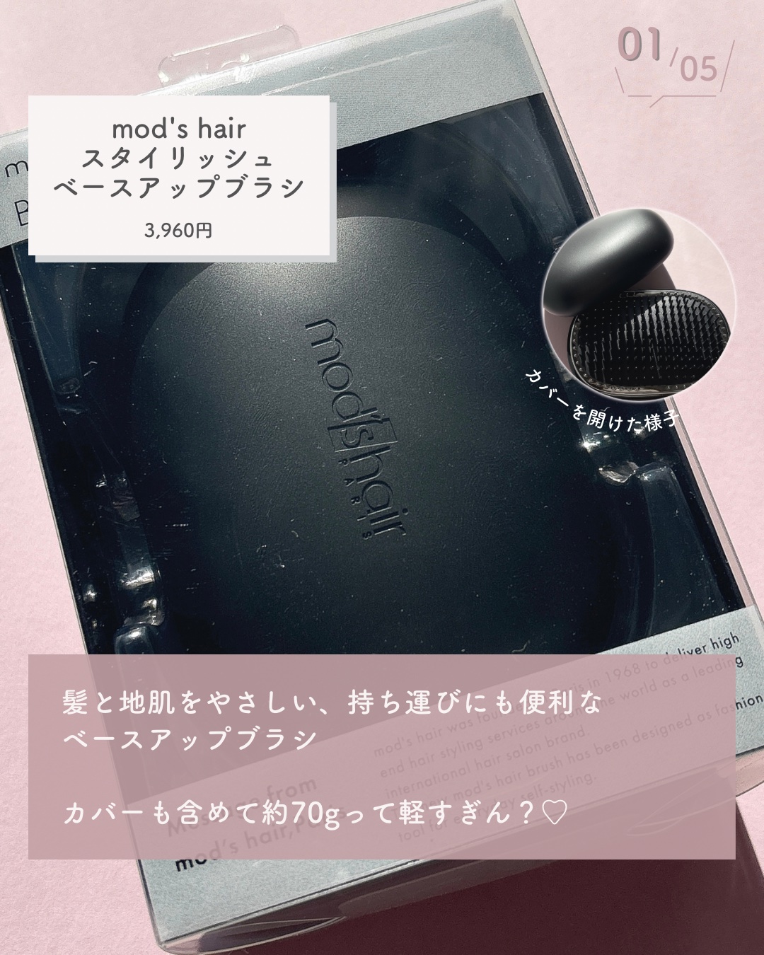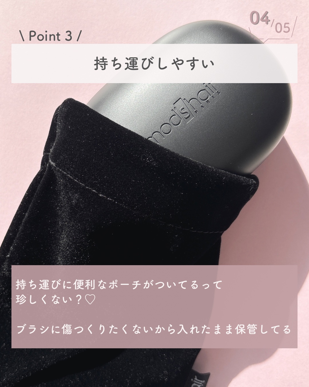 - 髪と地肌にやさしい使い心地、持ち運びにも便利なベースアップブラシ。 いつでも、どこでも、スタイリング。 POINT1:ころんっとスタイリッシュなデザイン ころんっとしたフォルムで、かわいいデザイン。 丸みのある、持ちやすい設計にしました。 POINT2:さらっとした仕上がりに メッキピン構造で、静電気を低減させ、とかすだけでさらさら髪に仕上がります。 POINT3:髪と地肌にやさしいとかし心地 3段階の高さのブラシピンで髪の絡まりを引っ張ることなく優しく解きほぐします。 クッション部は、クッション効果で地肌も気持よくとかせます。 POINT4:持ち運びに便利なカバー マグネットカバーでカチッと収納、ポーチもついて持ち運びもスマートに。 その他の特長 ・持ち運びや収納に便利なポーチ付き ・抗菌剤入り いつでも、どこでもさらっとまとまる髪に仕上がります。
