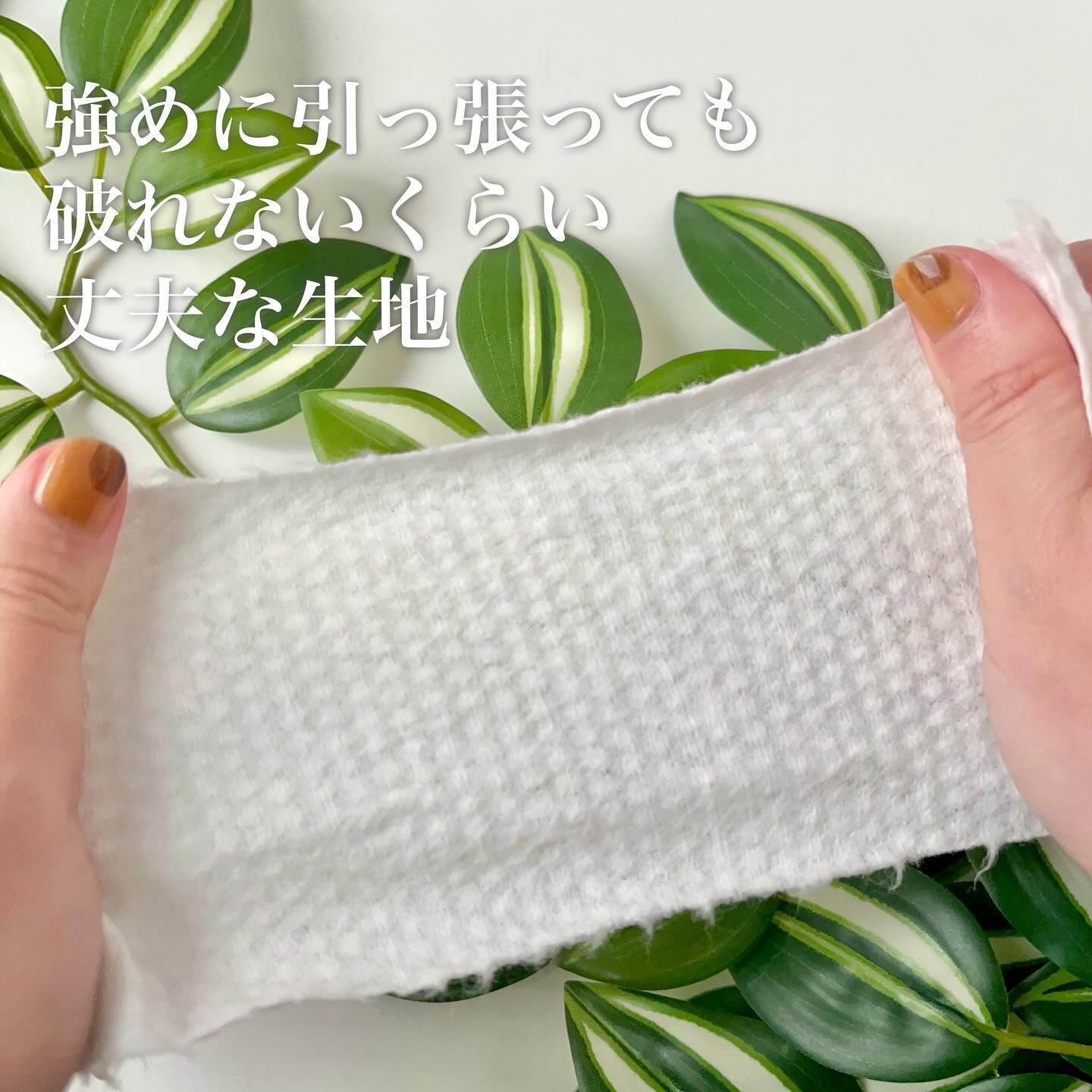 - コットンやタオルとしてミシン目でカットして使えるクレンジングタオルです。使い捨てタイプで、タオルの雑菌や汚れを気にすることなく清潔さを保つことができます。生地は、100%植物繊維(パルプ、レーヨン)を使用しているため吸水性に優れ、毛羽立たず繊維がお肌に残りません。また表面は凹凸加工がされており、1枚あたり約22cm × 10cmと小さくできるため、メイク落としやマニキュアオフの用途にも向いています。商品は1ロール約148シートが入っていますが、洗面台などに置いていても圧迫感の少ないパッケージデザインです。