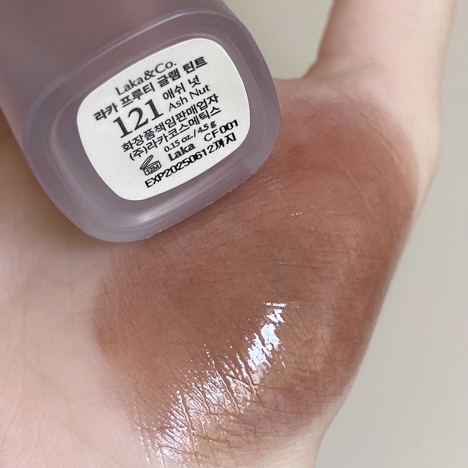 【彩度低めカラー】ちゅるちゅる光沢ティントリップ♡LakaFruityGlamTint121AshNut✼••┈┈••✼••┈┈••✼••┈┈••✼••┈┈••✼レッドやピンク系リップを使うことが多いけれど、アイメイクが濃いときに活躍してくれ...