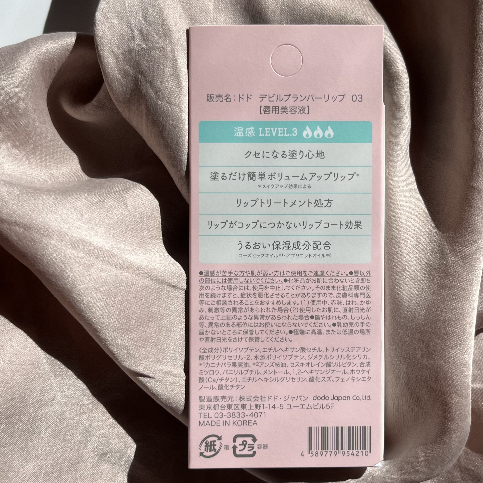 - 韓国でも大人気、塗るだけでぷっくりとしたとした厚みとハリ感を演出するプランパーリップ。 ドドのデビルプランパーリップは、くちびるにむっちりとしたハリ感を与えつつ、クセになるバニリルブチルでジンジンする温感を、メントールでスースーする爽快感を与えます。 レベルが3段階にわかれており、初心者向けから上級者向けの刺激感を与えて楽しめます。 オリジナル水分膜処方で、唇をしっかりコーティングしてくれて、コップへの色うつりも防ぎます。 手持ちのリップの上からの使用も可能で、リップコートとしても使用できます。