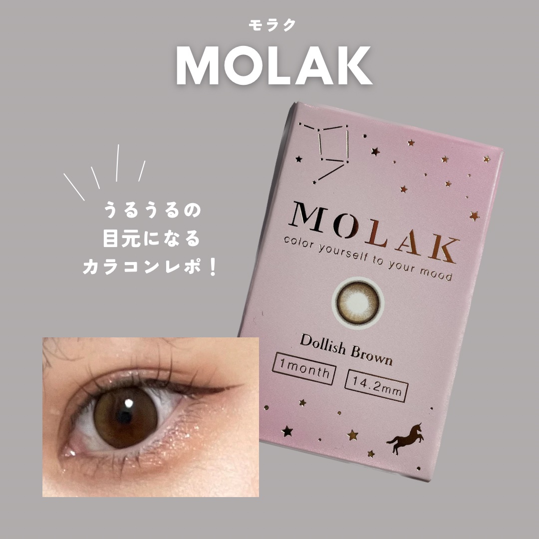 - ※2025年6月以降、商品パッケージ裏面・側面の一部表記を変更いたします。尚、これにかかる商品の交換・返品は承っておりません。 MOLAKは、常に変化する自分の気分に寄り添い、自分らしさを引き立てるカラーコンタクトレンズブランドです。 瞳の印象を引き立てるカラーリングと繊細なデザインで、自然な美しさを演出します。 カラーコンタクトレンズの不適正使用による眼障害の危険性等などがあります。 ●コンタクトレンズは高度管理医療機器です。不十分な洗浄・消毒など不適切なケアや、長時間・交換期間を超えた装用により、アレルギー性結膜炎、角膜感染症、角膜潰瘍等の重篤な眼障害が発生する危険性があります ●ご使用前に取扱説明書を確認してください 使用上の留意事項 ●眼科医院等を受診してからお求めください ●眼に異常を感じたら直ちにレンズ使用を中止し、お近くの眼科等で診察を受けてください ●医師の指示にしたがってご使用ください ●コンタクトレンズを装用する場合、自覚症状がなくても、眼科医院等での定期検査を受けてください ●レンズに不具合がある場合は使用しないでください