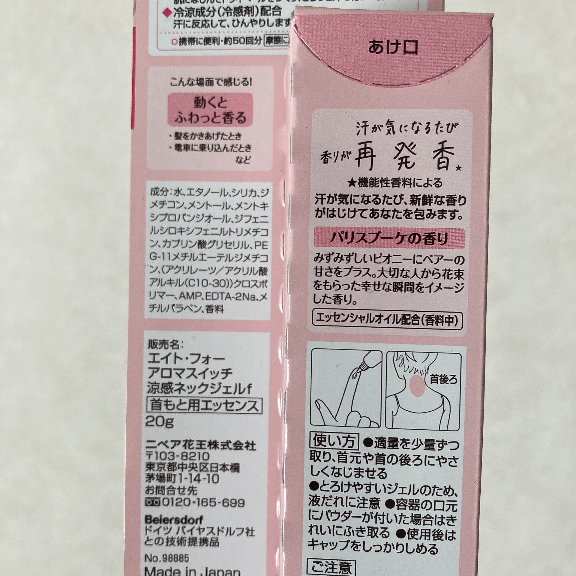- 首のベタつきを抑え、髪の張り付きを防ぎます 汗が気になるたび、新鮮な香りがはじけてさらっと涼やか ●ジェルが肌をまもって整えます ●汗吸収さらさらパウダー(基剤)配合 肌になじんでドライベールをつくり、さらっと汗を乾かし続けます ●冷涼成分(冷感剤)配合 汗に反応して、ひんやりします ●汗が気になるたび香りが再発香(*2) 汗が気になるたび、新鮮な香りがはじけてあなたを包みます (*2)機能性香料によるカバーリング効果 ●摩擦に強く落ちにくいこすれプルーフ処方 ●携帯に便利なサイズ。約50回使えます ●海外の都市やシーンをイメージした3種類の香り いずれもエッセンシャルオイル配合(香料中)。 パリスブーケの香り:みずみずしいピオニーにペア一の甘さをプラス。大切な人から花束をもらった幸せな瞬間をイメージした香り