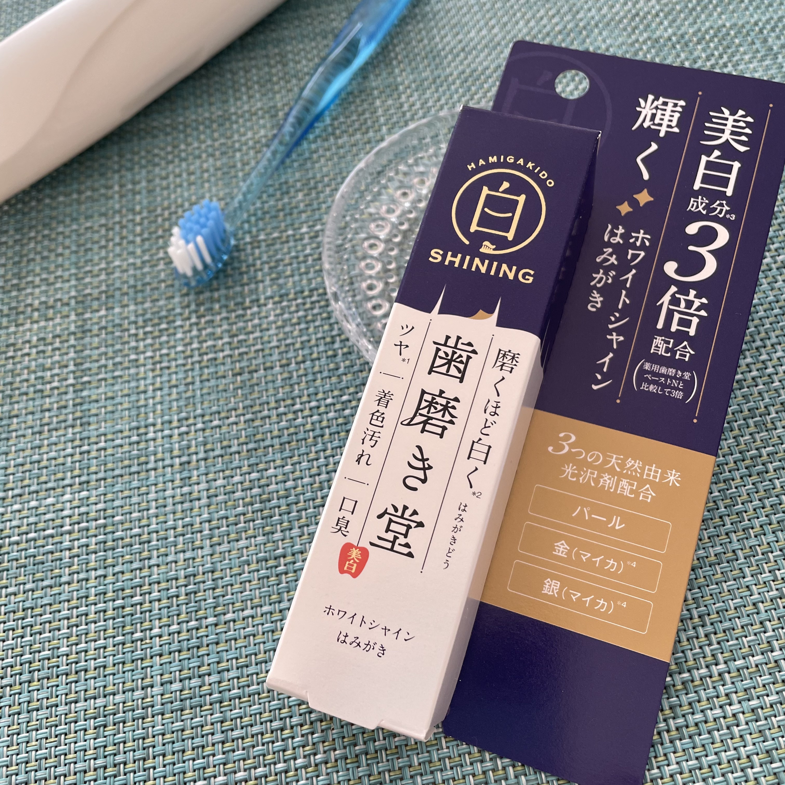 - 磨くほど白く(*1)。3つの天然由来光沢剤を配合、美白成分(*2)を3倍配合したホワイトシャイン ペースト。(薬用歯磨き堂ペーストNと比較して)ツヤ(*3)・着色汚れ・口臭ケアに。 ●天然由来光沢剤:パール・金(マイカ)(*4)・銀(マイカ)(*4) ●効果・効能:歯を白くする/歯のやにをとる/口臭を防ぐ/むし歯を防ぐ/歯石の沈着を防ぐ/歯垢を除去する/口中を浄化する ●週1回の集中ケアとして「歯磨き堂 電動ホワイトニングクリーナー」(別売)との併用もおすすめです *1 ブラッシングにより本来の歯の白さに近づけること *2 清掃助剤:リン酸3Ca、ヒドロキシアパタイト、ケイ酸Ca *3 光沢剤による *4 金:酸化チタン・マイカ・酸化鉄、銀:酸化チタン・マイカ