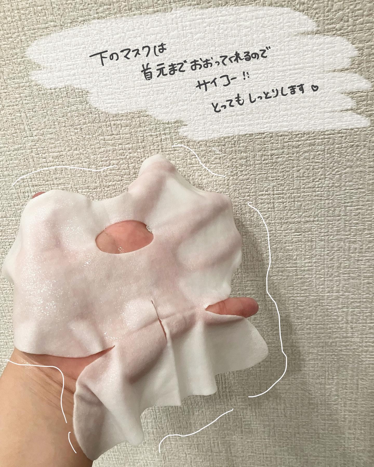 韓国でも日本でも大人気みたいですね✨ 韓国行く人が居たら必ず買ってきてもらうお気に入りのマスクです♡ 夜使うと翌朝肌が内側からふっくらして肌がモチモチになる気がします♡ 首の部分までケアできるのが嬉しいけど長さ的に首は上の部分しかできないかも?