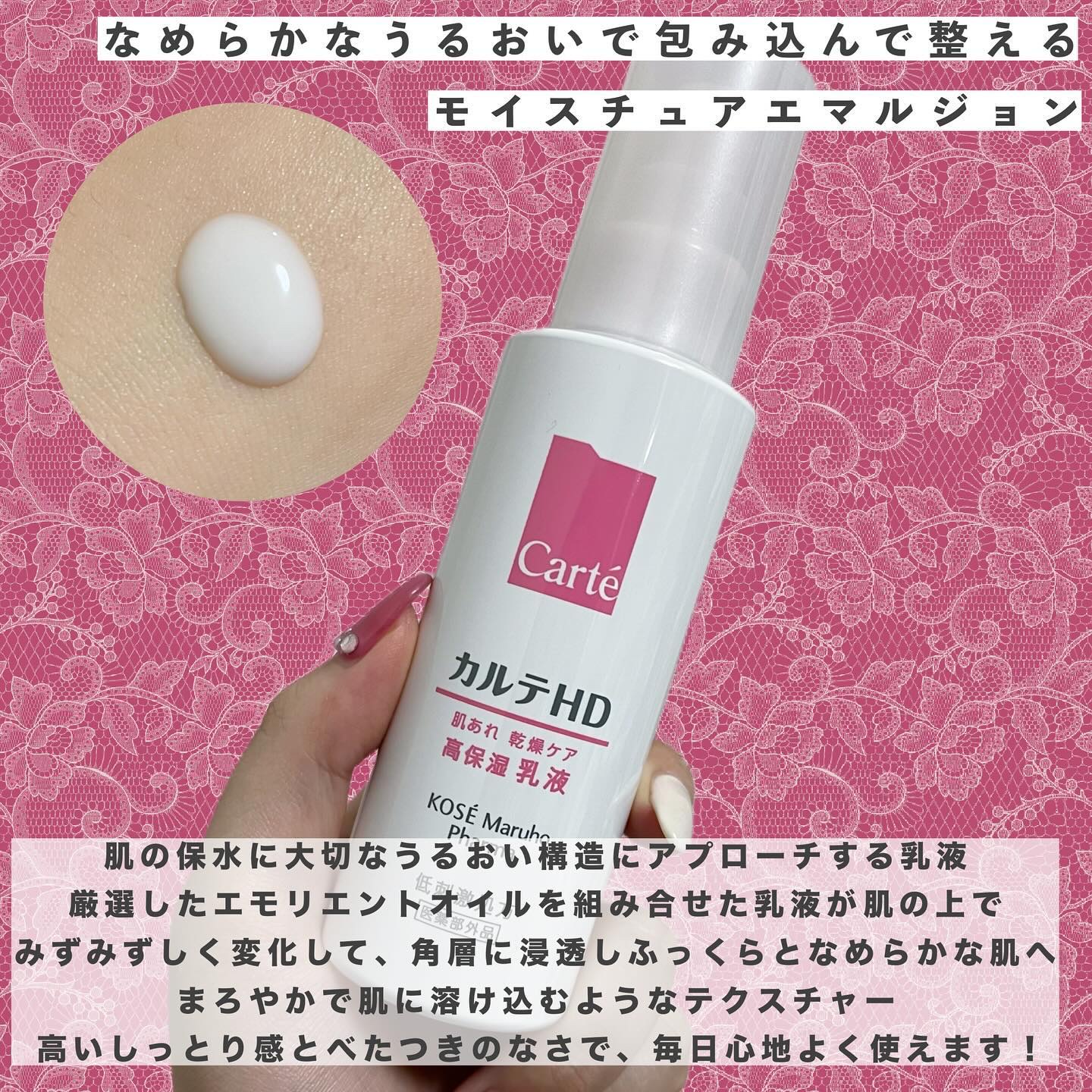 肌荒れ防止有効成分が嬉しい♡#カルテHD#モイスチュアローション#モイスチュアエマルジョン美容液がとけ込んだうるおいで角層の奥深く、すみずみまで満たす、高保湿化粧水。あれがちな肌ももっちりなめらかに整え、過酷な環境でもうるおいを長時間肌にとじ...