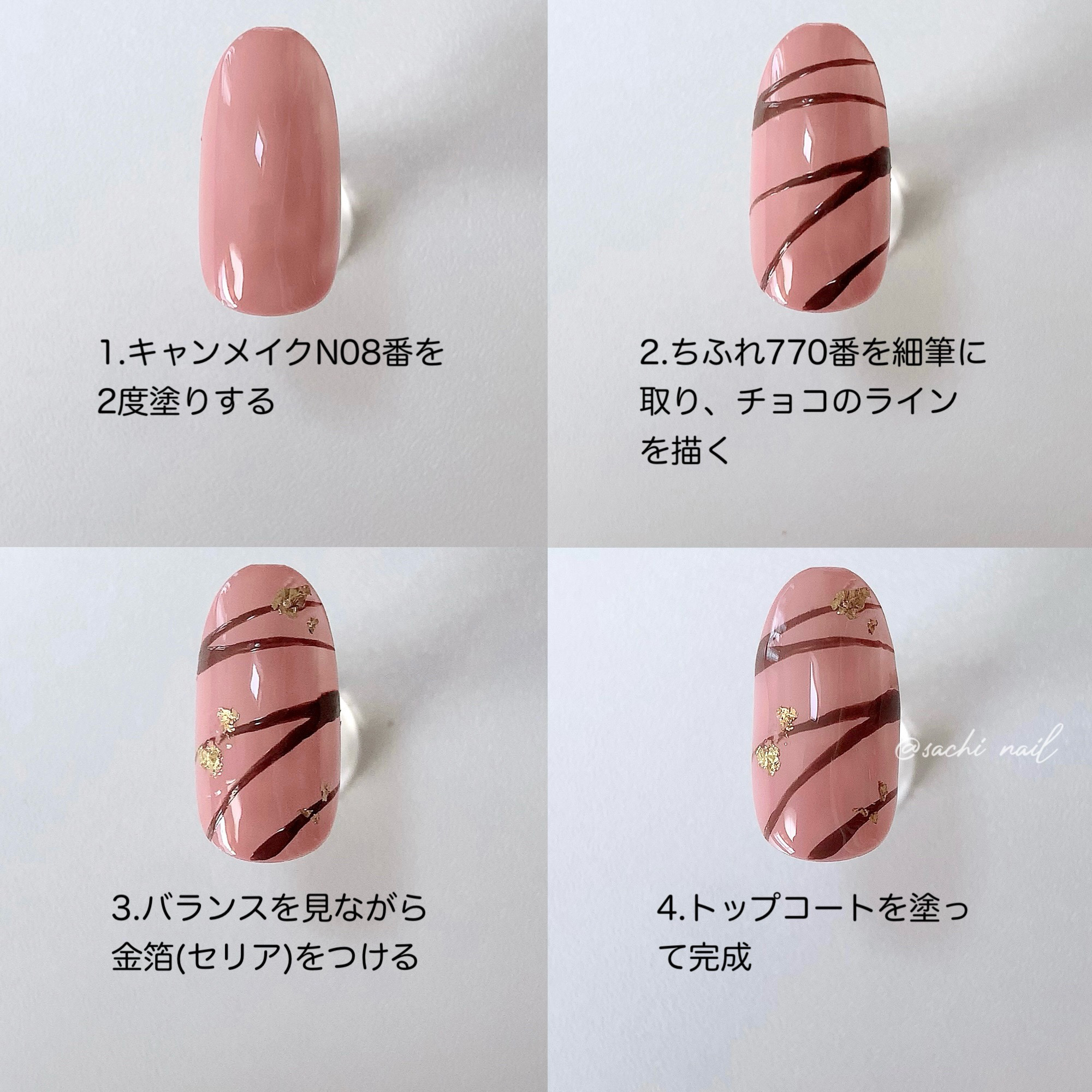 ワンカラーでも指ごとに色を変えるだけでオシャレに見えます💕 画像のようにゴールドラインとストーンを少し足すだけで華やかさがアップ🥰 何度かご紹介したことのあるスポンジで作るグラデーションです✨ スポンジを使うことで境目が綺麗に馴染んでくれます💕 アルミホイルの上でブラウンとトップコートを1:1くらいで混ぜたものを、トップコートのハケに取って3箇所に塗るだけ👌 事前に混ぜたものを塗ることで、爪の上でぼかすより簡単に出来ます💕 ベースカラーが乾く前に点置きしてぼかすことで綺麗にぼかせます✨ スピードが大事なので、使うポリッシュのキャップは全て開けておきましょう😊 天然石のラインはガタガタの方がより天然石っぽく見えるので、ラインを描くのが苦手な方でも大丈夫🙆♀️ 難しそうに見えて、やってみると意外と簡単に出来ます♡