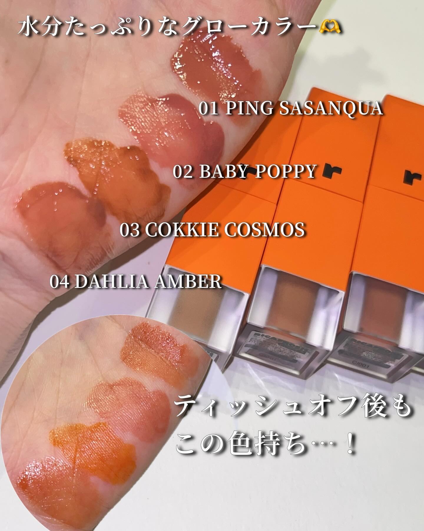 まずパケがめちゃくちゃ可愛くないですか?! 塗り心地はすっごいみずみずしい😳✨ 色味も変に浮いたりせずよかったしティッシュオフしてもこの色残り…!さすが🙌❤️ 今回のティントは、既存のティントより透明感が高く透け感のある塗り心地が特徴的で香りも強くないので韓国コスメが苦手な方でも大丈夫だと思います👯♀️✨ 本当にナチュラルにツヤっとするので一番使いやすいい質感のティントだと思いました🙌✨