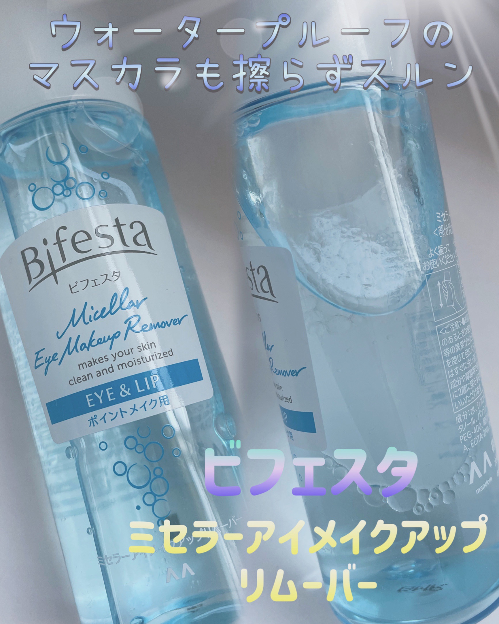 やっぱりあるとないとでちがう!ビフェスタ ミセラーアイメイクアップリムーバー ビフェスタさまのアンケートモニターでリムーバーをいただきました!ビタミンB誘導体(パンテノール)とビタミンE誘導体(酢酸トコフェロール)が保湿成分として含まれ、やさ...