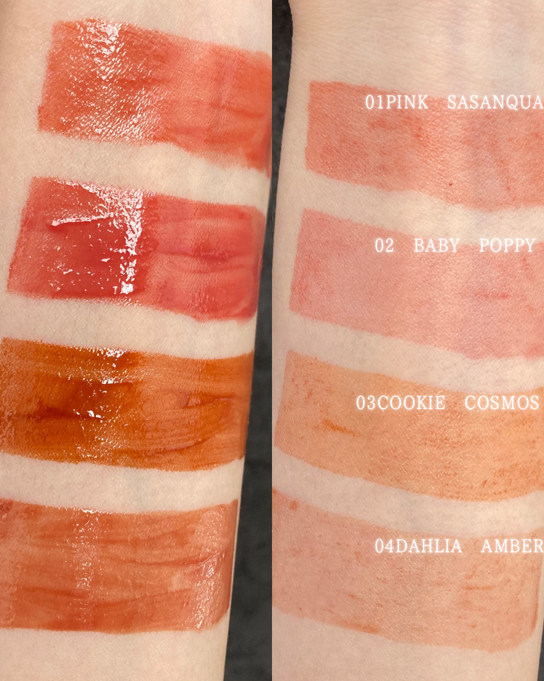 うるつやコーティングで色持ち・保湿24時間持続(臨床試験済み)なRICAFROSHのリップ。 使用したのは04番のDAHLIA AMBER(ダリアアンバー)、ほんのりとピンクをしのばせたスパイシーロゼブラウン。 さらっとしたテクスチャーで、香りはありませんが少し甘めの味がします。
