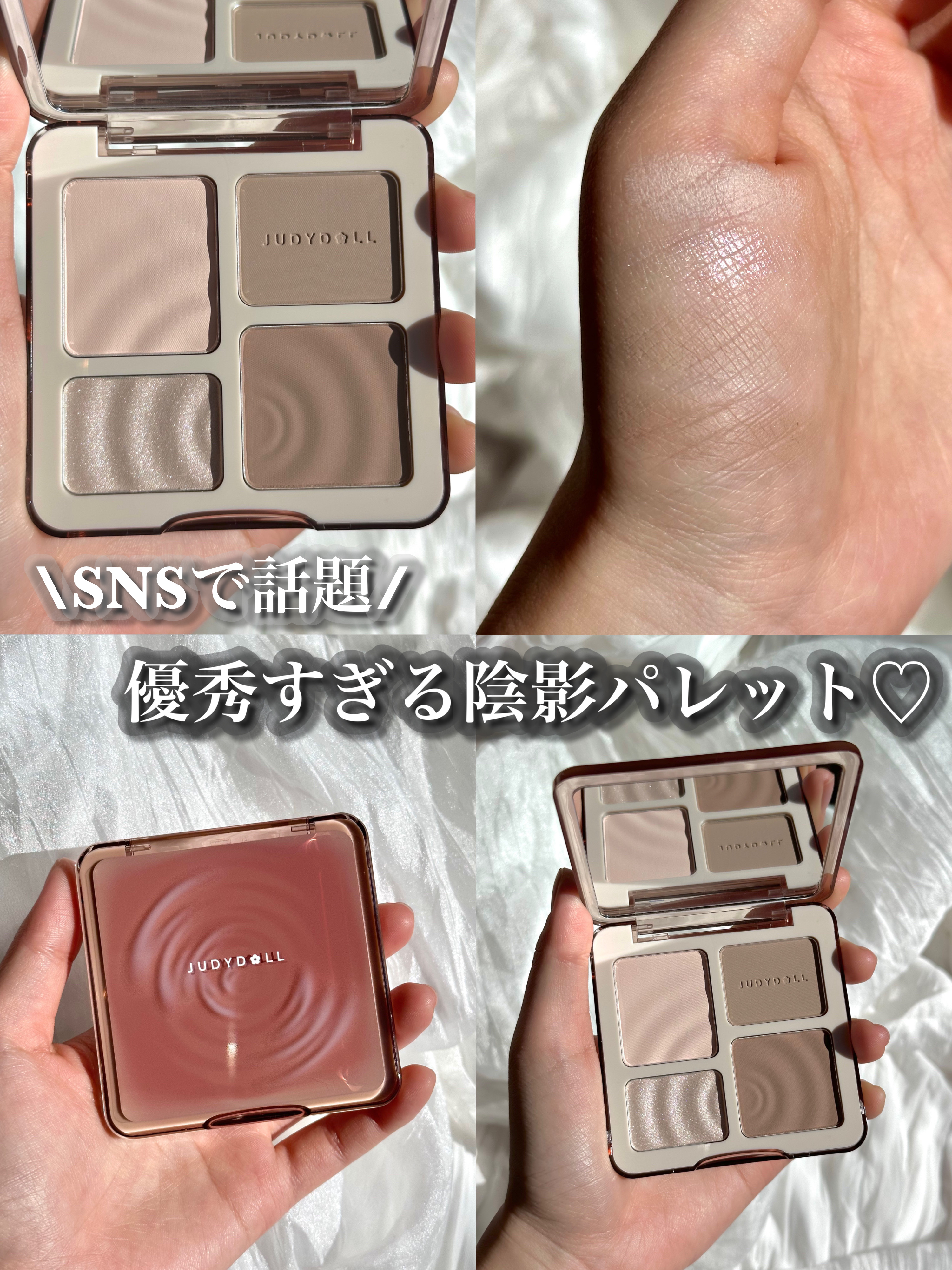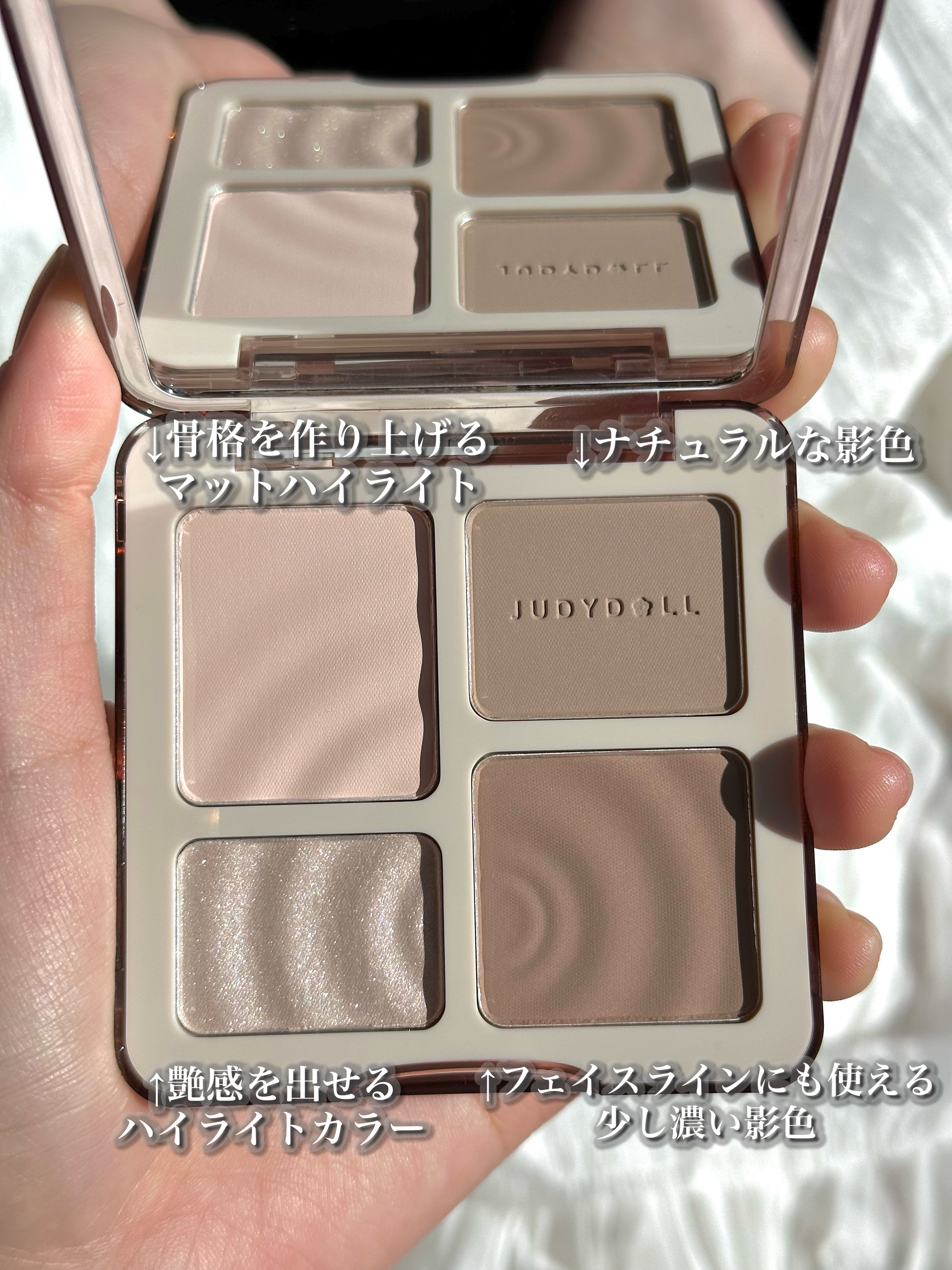 メイクレシピ常連でバズっている JUDYDOLL メリハリマスターパレット¥2,090 マットハイライトが目的で購入したので容量多くてうれしい🌟 マットハイライトの2色の色の違いは塗ってみるとほんのりと感じるくらいです! カラー別の使用例として公式サイトの写真を載せているので参照ください🙇🏻♀️