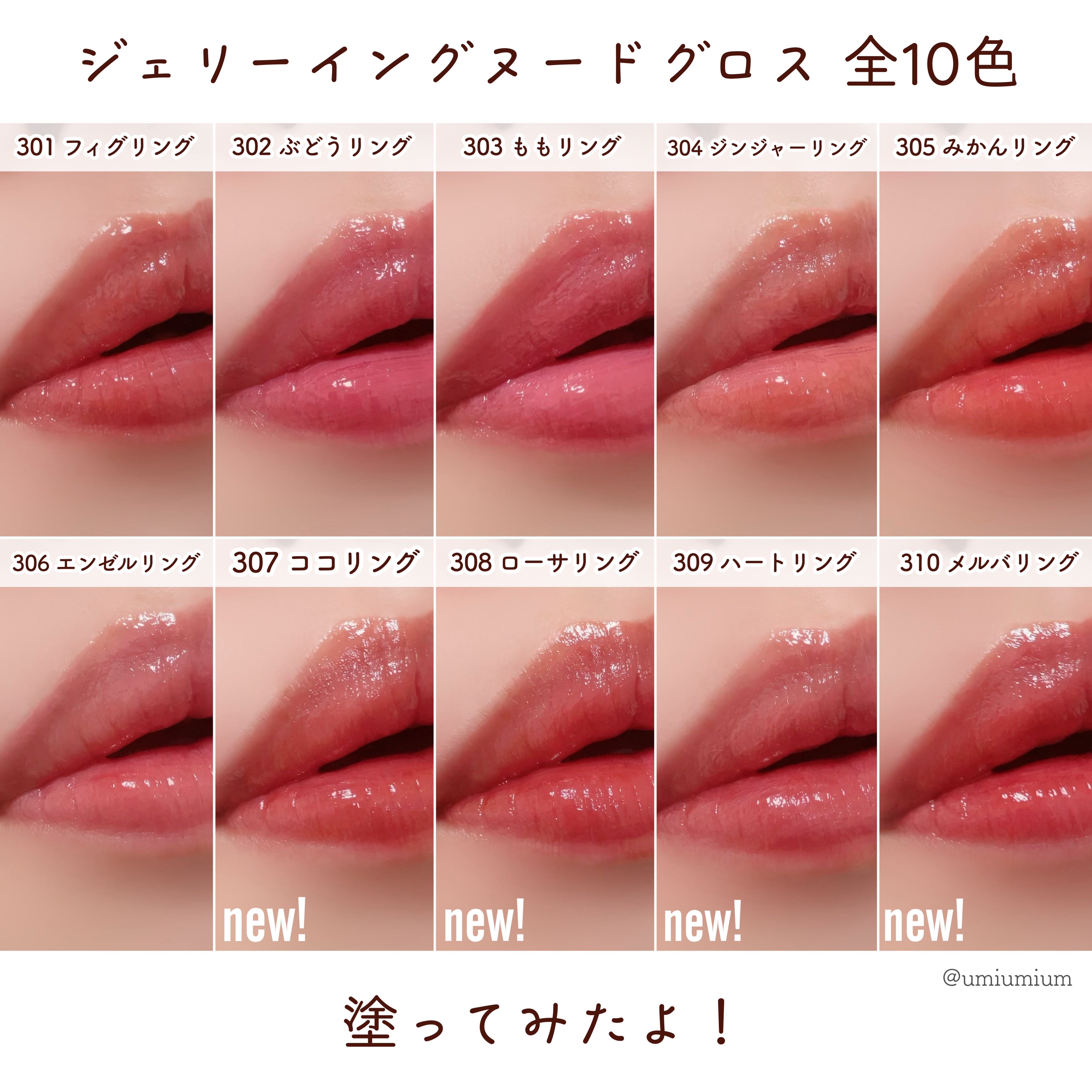 - <301 フィグリング> ジフェニルジメチコン、水、リンゴ酸ジイソステアリル、ビスジグリセリルポリアシルアジペート-2、オクチルドデカノール、水添ポリイソブテン、ダイマージリノール酸ダイマージリノレイルビス(ベヘニル/イ ソステアリル/フィトステリル)、セチルPEG/PPG-10/1ジメチコン、グリセリン、BG、イソステア リン酸ソルビタン(小麦由来)、ポリソルベート60(小麦由来)、ペンチレングリコール、(アクリル酸ヒドロキシエチル/アクリロイルジメチルタウ リンNa)コポリマー、セテアレス- 20、スクワラン、フェノキシエタノール、ステビオシド、香料、エチルヘキシルグリセリン、水酸化Al、ポリアクリル酸アンモニウム、[+/-]酸化チ タン、黄4、赤227、黄5、青1 <302 ぶどうリング> ジフェニルジメチコン、水、リンゴ酸ジイソステアリル、ビスジグリセリルポリアシルアジペート-2、オクチルドデカノール、水添ポリイソブテン、ダイマージリノール酸ダイマージリノレイルビス(ベヘニル/イ ソステアリル/フィトステリル)、セチルPEG/PPG-10/1ジメチコン、グリセリン、BG、イソステア リン酸ソルビタン(小麦由来)、ポリソルベート60(小麦由来)、ペンチレングリコール、(アクリル酸ヒドロキシエチル/アクリロイルジメチルタウ リンNa)コポリマー、セテアレス- 20、スクワラン、フェノキシエタノール、ステビオシド、香料、エチルヘキシルグリセリン、水酸化Al、ポリアクリル酸アンモニウム、[+/-]酸化チ タン、黄4、赤227、黄5、青1 <303 ももリング> ジフェニルジメチコン、水、リンゴ酸ジイソステアリル、ビスジグリセリルポリアシルアジペート-2、オクチルドデカノール、水添ポリイソブテン、ダイマージリノール酸ダイマージリノレイルビス(ベヘニル/イ ソステアリル/フィトステリル)、セチルPEG/PPG-10/1ジメチコン、グリセリン、BG、イソステア リン酸ソルビタン(小麦由来)、ポリソルベート60(小麦由来)、ペンチレングリコール、(アクリル酸ヒドロキシエチル/アクリロイルジメチルタウ リンNa)コポリマー、セテアレス- 20、スクワラン、フェノキシエタノール、ステビオシド、香料、エチルヘキシルグリセリン、水酸化Al、ポリアクリル酸アンモニウム、[+/-]酸化チ タン、黄4、赤227、黄5、青1 <304 ジンジャーリング> ジフェニルジメチコン、水、リンゴ酸ジイソステアリル、ビスジグリセリルポリアシルアジペート-2、オクチルドデカノール、水添ポリイソブテン、ダイマージリノール酸ダイマージリノレイルビス(ベヘニル/イ ソステアリル/フィトステリル)、セチルPEG/PPG-10/1ジメチコン、グリセリン、BG、イソステア リン酸ソルビタン(小麦由来)、ポリソルベート60(小麦由来)、ペンチレングリコール、(アクリル酸ヒドロキシエチル/アクリロイルジメチルタウ リンNa)コポリマー、セテアレス- 20、スクワラン、フェノキシエタノール、ステビオシド、香料、エチルヘキシルグリセリン、水酸化Al、ポリアクリル酸アンモニウム、[+/-]酸化チ タン、黄4、赤227、黄5、青1 <305 みかんリング> ジフェニルジメチコン、水、リンゴ酸ジイソステアリル、ビスジグリセリルポリアシルアジペート-2、オクチルドデカノール、水添ポリイソブテン、ダイマージリノール酸ダイマージリノレイルビス(ベヘニル/イ ソステアリル/フィトステリル)、セチルPEG/PPG-10/1ジメチコン、グリセリン、BG、イソステア リン酸ソルビタン(小麦由来)、ポリソルベート60(小麦由来)、ペンチレングリコール、(アクリル酸ヒドロキシエチル/アクリロイルジメチルタウ リンNa)コポリマー、セテアレス- 20、スクワラン、フェノキシエタノール、ステビオシド、香料、エチルヘキシルグリセリン、水酸化Al、ポリアクリル酸アンモニウム、[+/-]酸化チ タン、黄4、赤227、黄5、青1 <306 エンジェルリング> ジフェニルジメチコン、水、リンゴ酸ジイソステアリル、ビスジグリセリルポリアシルアジペート-2、オクチルドデカノール、水添ポリイソブテン、ダイマージリノール酸ダイマージリノレイルビス(ベヘニル/イ ソステアリル/フィトステリル)、セチルPEG/PPG-10/1ジメチコン、グリセリン、BG、イソステア リン酸ソルビタン(小麦由来)、ポリソルベート60(小麦由来)、ペンチレングリコール、(アクリル酸ヒドロキシエチル/アクリロイルジメチルタウ リンNa)コポリマー、セテアレス- 20、スクワラン、フェノキシエタノール、ステビオシド、香料、エチルヘキシルグリセリン、水酸化Al、ポリアクリル酸アンモニウム、[+/-]酸化チ タン、黄4、赤227、黄5、青1 <307 ココリング> ジフェニルジメチコン、水、リンゴ酸ジイソステアリル、ビスジグリセリルポリアシルアジペート-2、オクチルドデカノール、水添ポリイソブテン、ダイマージリノール酸ダイマージリノレイルビス(ベヘニル/イソステアリル/フィトステリル)、グリセリン、セチルPEG/PPG-10/1ジメチコン、BG、イソステアリン酸ソルビタン(小麦由来)、ポリソルベート60(小麦由来)、ペンチレングリコール、(アクリル酸ヒドロキシエチル/アク
