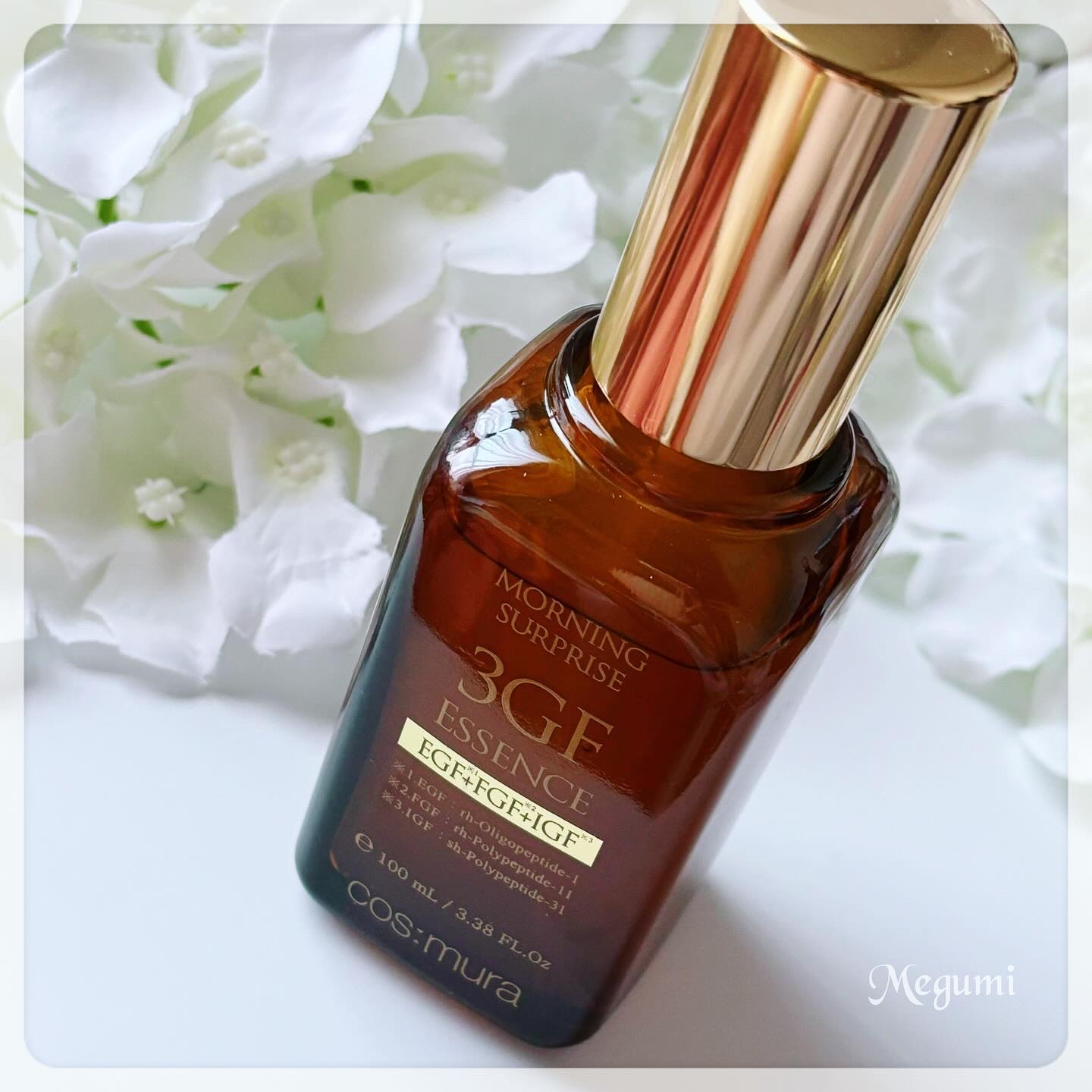 コスムラの3GFエッセンスはエイジングケアの定番とも言える成長因子を3つ(EGF、FGF、IGF)も含有しています。 水溶性美容液で水分補給もバッチリ、しかも刺激が少ないです。 高級感のあるデザインと成長因子3つEGF、FGF、IGFが含まれているとても贅沢な美容液なのでここ最近年齢肌が気になっている私にもすごく使いやすくてとても嬉しいです。