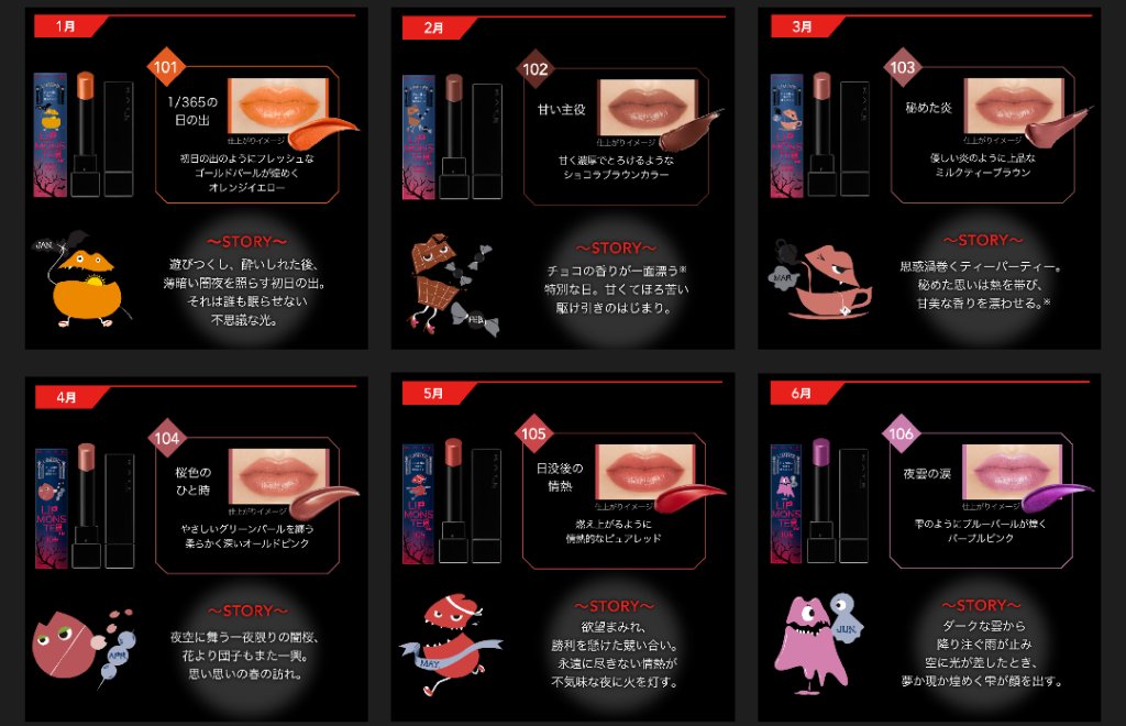 - 落ちにくさも美発色もよくばりたい、つけたての色が長時間持続する人気の口紅リップモンスター。 唇から蒸発する水分を活用して密着ジェル膜に変化する独自技術※で、つけたての色が長時間持続。 高発色&保湿。 ※当社独自の色持ち技術 ■花火のようにまぶしくきらめく 繊細なラメが際立つ限定色 EX-6 ピンクカラー×青ラメ【ロケット花火流星群】 EX-7 オレンジカラー×黄&緑ラメ【100万発の線香花火】 EX-8 レッドカラー×緑ラメ【打ち上げ花火ブランコ】 ■深みレッド系カラーの限定色 EX-9 戦慄の喜笑 (限定色) EX-10 狂気の怒号 (限定色) 【2025クリスマスコフレ】 落ちにくいリップモンスターから、唇の血色感を底上げする ホリデーシーズン限定の熱感ニュアンスベージュ系カラー登場。 EX-11 紅煙宿る贈り物(限定色):ボルドーベージュ系 EX-12 盗まれた1224mの星光(限定色):キャメルベージュ系