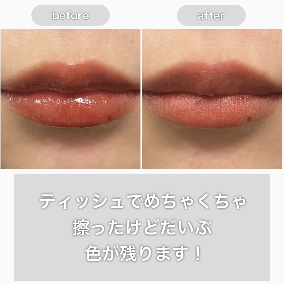 オイルテクスチャーでベタべタせず軽い着け心地です👌🏼 発色良くてぷるぷるな仕上がりになります✨ ティッシュオフするとツヤ感はなくなりますが、色は結構残ります! テクスチャーも発色の良さも色味もわたし好みでした🫶🏻
