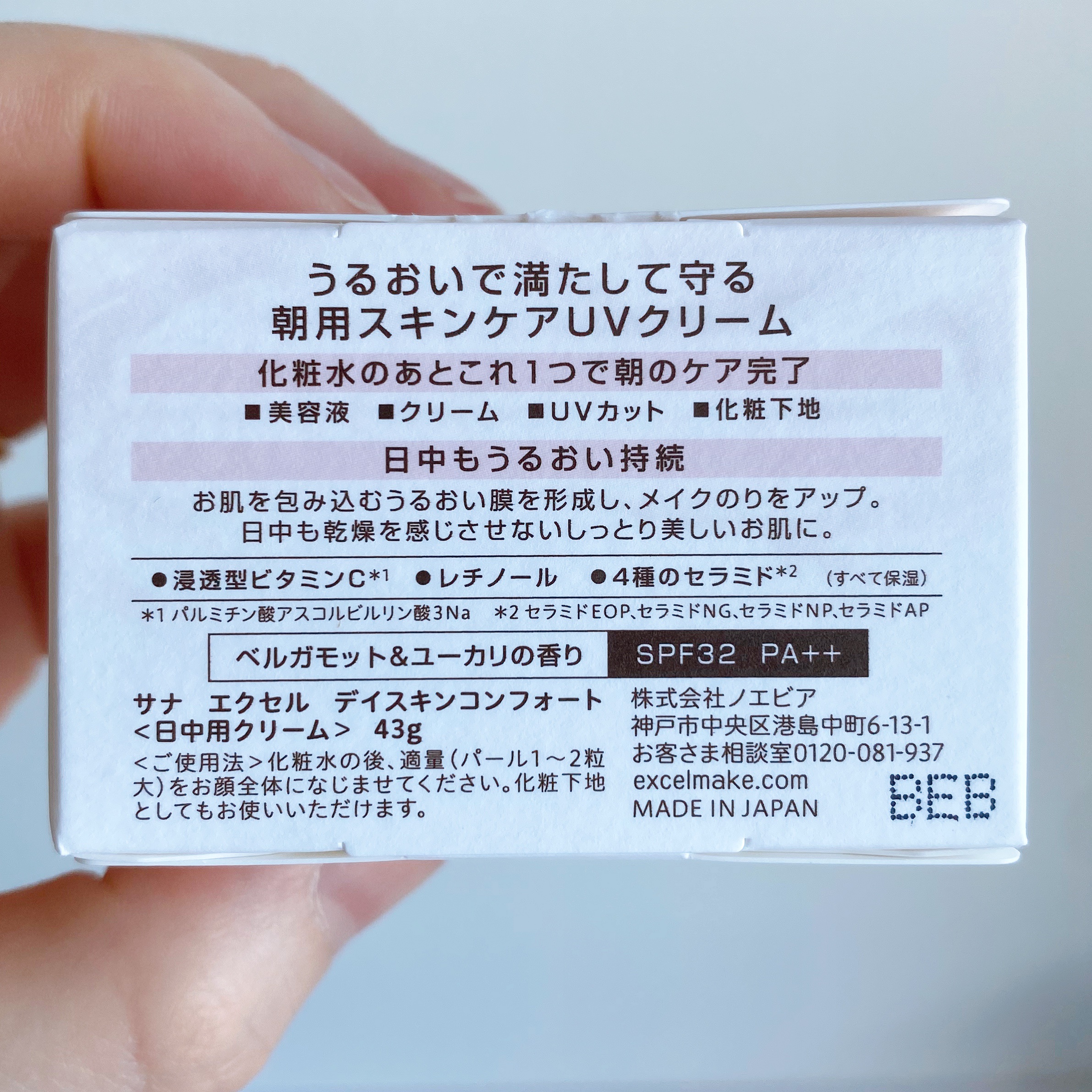- うるおいで満たして守る朝用スキンケアUVクリーム 化粧水のあとこれ1つで朝のケア完了 ■美容液 ■クリーム ■UVカット ■化粧下地 日中もうるおい持続 うるおい膜でお肌を包み込み、メイクのりをアップ。 日中も乾燥を感じにくいしっとり美しいお肌に。 ●浸透*1型ビタミンC*2 ●レチノール ●4種のセラミド*3(すべて保湿) SPF32 PA++ 日中用クリーム 1日の始まりにやわらぐベルガモット&ユーカリの香り お好みの下地を重ねてもOK *1角質層まで *2パルミチン酸アスコルビルリン酸3Na *3セラミドEOP、セラミドNG、セラミドNP、セラミドAP 【エクセル ’24 ベースアイテムセット DC】 ◇お肌に異常が生じていないかよく注意して使用してください。 ◇傷・はれもの・しっしん等異常のあるときは、お使いにならないでください。 ◇使用中、または使用後日光にあたって、赤味・はれ・かゆみ・刺激・色抜け(白斑等)や黒ずみ等の異常があらわれたときは、使用を中止し、皮フ科専門医等にご相談されることをおすすめします。そのまま化粧品類の使用を続けますと悪化することがあります。 ◇極端な高温や低温、直射日光を避け、乳幼児の手の届かないところに保管してください。 サナ エクセル デイスキンコンフォート ◇使用後はしっかりフタを閉めてください。 ◇衣服についた場合、塩素系漂白剤の使用は避けてください。 サナ エクセル フェザライズオン パウダー ◇落としたり、強い衝撃を与えたりすると中身が割れることがありますのでご注意ください。
