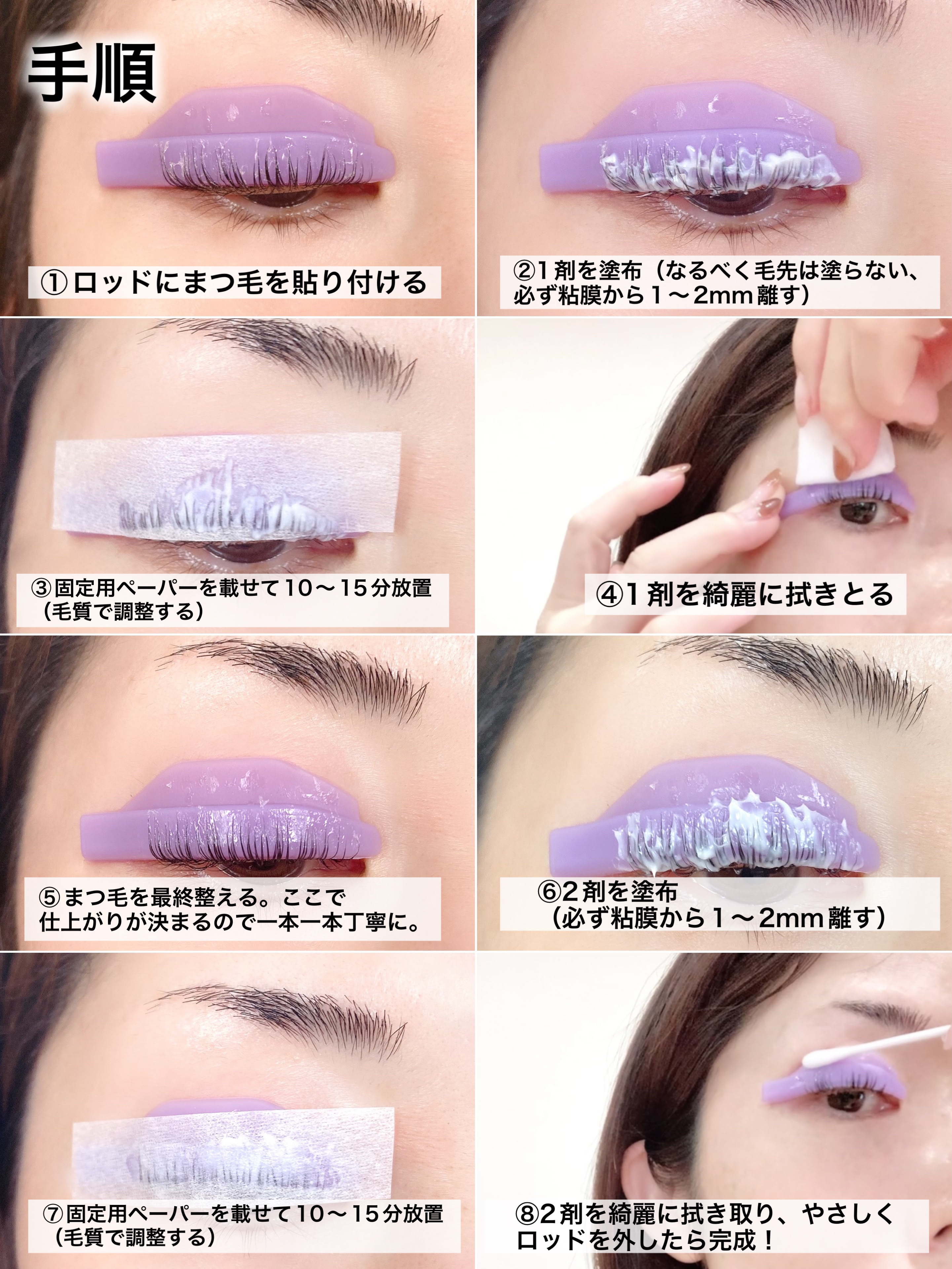 自宅でまつ毛パーマが出来るよ✨️ 必要な物が全て揃っていて、日本語の説明書付き。 CカールとLカールの選べるロッドにサイズも豊富🫶 翌日もしっかりカールしていて嬉しいです🙌