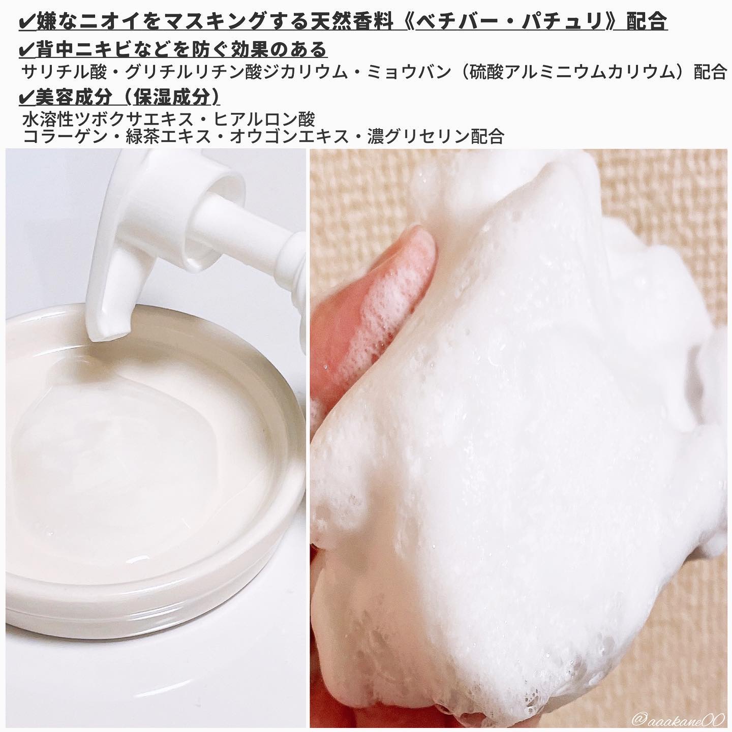 ニオイとニキビが気になる方向けのボディウォッシュ! 年齢を重ねるたびにニオイが気になりはじめた、汗などあらゆるニオイを何とかしたい、背中ニキビが悩み、そんな方にぴったりなのがこちら☺️ 嫌なニオイをマスキングする天然香料(べチバー・パチュリ)配合した薬用処方のボディウォッシュで、ニオイだけでなくニキビも防ぎます✨ とろみの強いテクスチャで泡立てるともっちり泡に❤️ 気持ちよくボディ洗浄出来たし、やさしい香りにもいやされました。