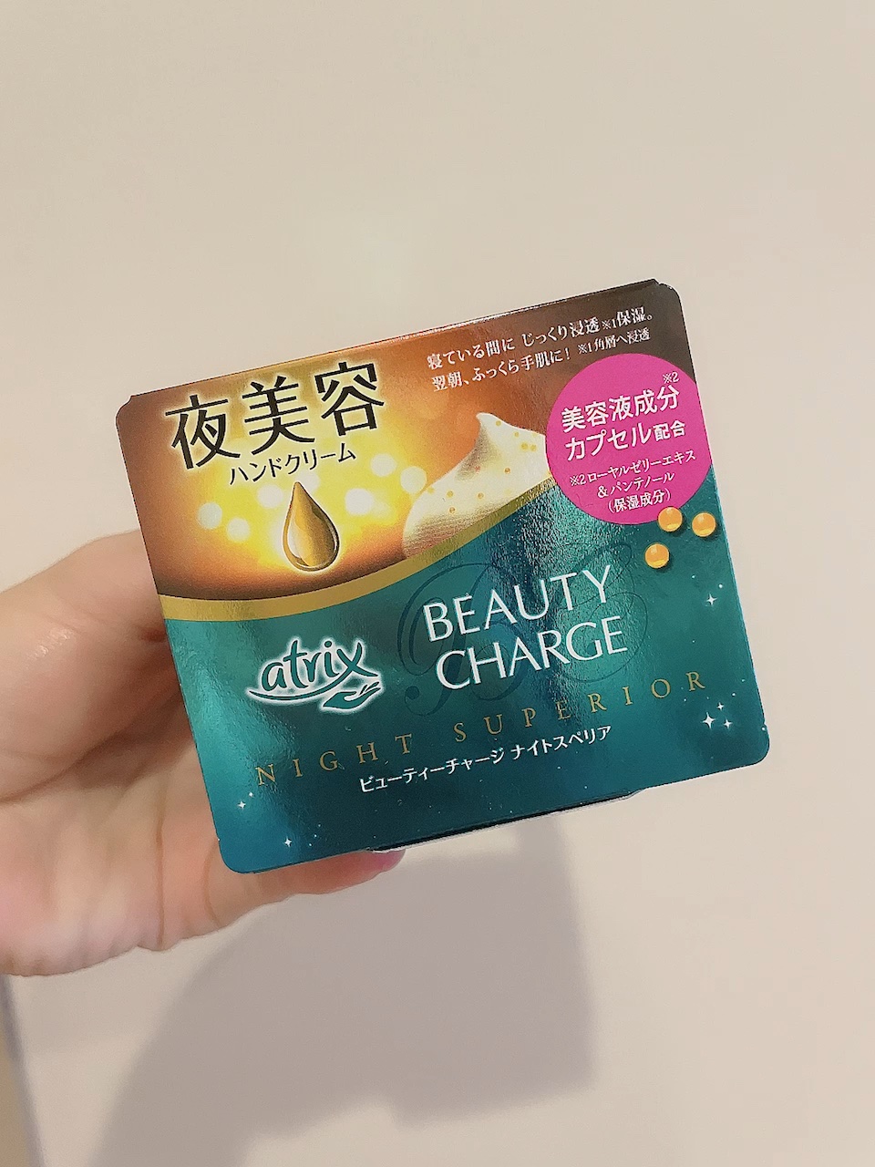 こっくり濃厚なクリームにたっぷりの美容液成分(ローヤルゼリーエキス・パンテノール)がぎゅっと詰まったカプセルを配合したナイトケア用ハンドクリームです。 浸透型ヒアルロン酸コラーゲンEX(ヒアルロン酸・コラーゲン・グリセリン)とアボカドオイルEX(アボカドオイル・シア脂・ワセリン・グリセリン誘導体)を配合したハンドクリームです。 日中はチューブ、おやすみ前はジャータイプでしっかり保湿してもっちりうるおいのある手に!