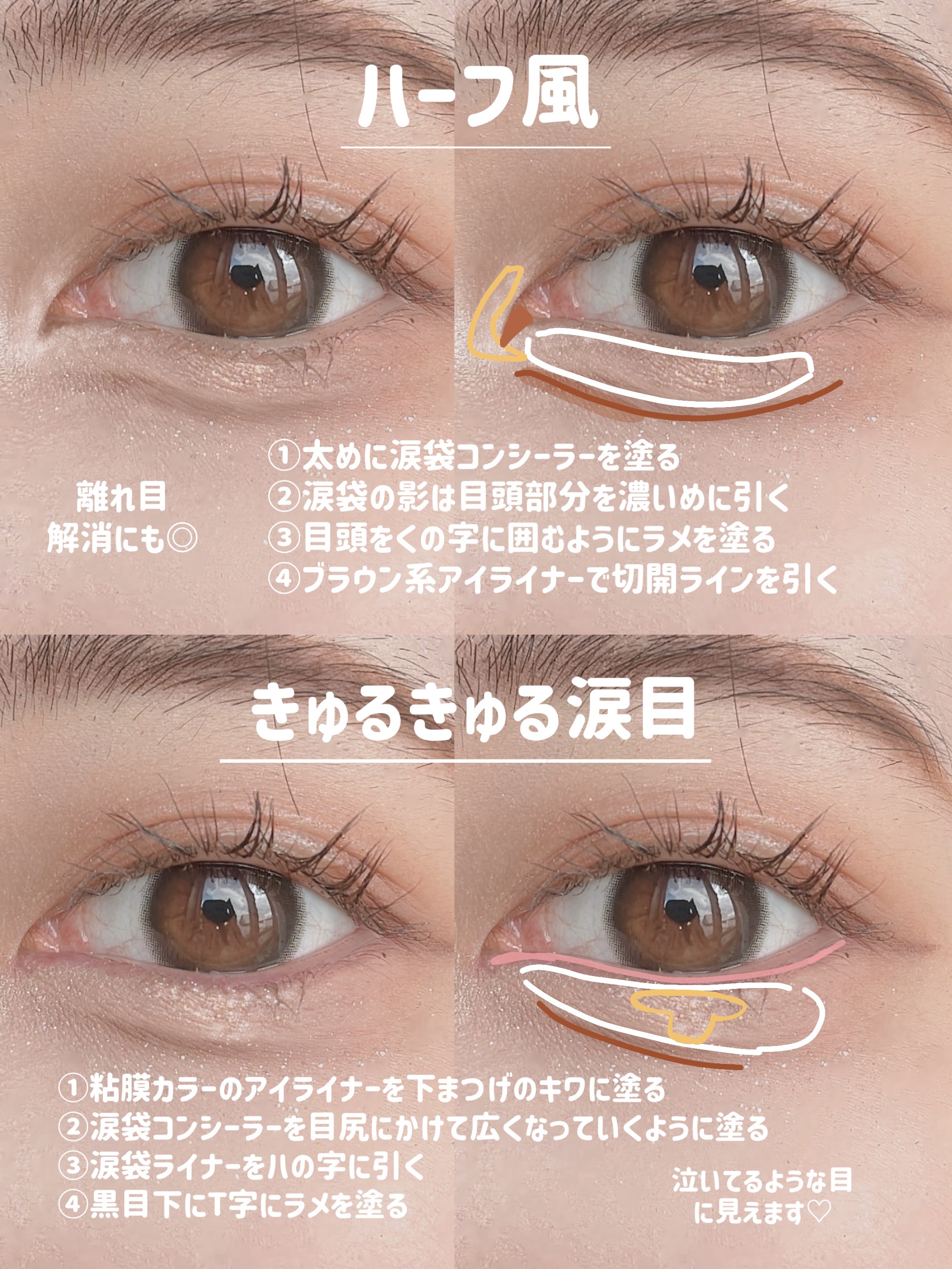 くりくり丸目と韓ドル風めちゃ好みな感じ…♡ ハーフ風のやつほんとにハーフの子みたいで可愛い🤦🏻♀️ 涙袋以外でもひとつ変えてみるだけで一気に印象変わるからメイクって飽きないし楽しいよね😽