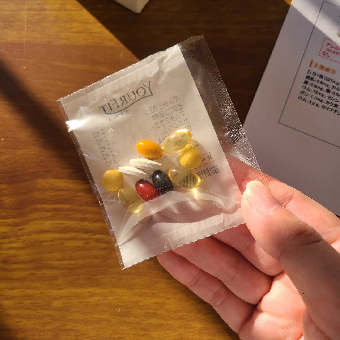 簡単なアンケートに答えていくだけで、自分の栄養状態(なにが不足してる・なにを摂取し過ぎてる)を分析して1人1人違うサプリメントを組み合わせてオリジナルのものを紹介してくれます。 実際に届いたものは1日分ずつ包装されているので、数種類飲むのに手軽で時短でした! サプリを数種類飲むときに、いくつもボトルやパウチを開け締めするのは面倒だったので「YOURFIT」は良かったです😊 1つ1つの効能が詳しく説明されていたり、アンケートに基づいた生活習慣や食についてのアドバイスもしてくれるのが勉強になりました。