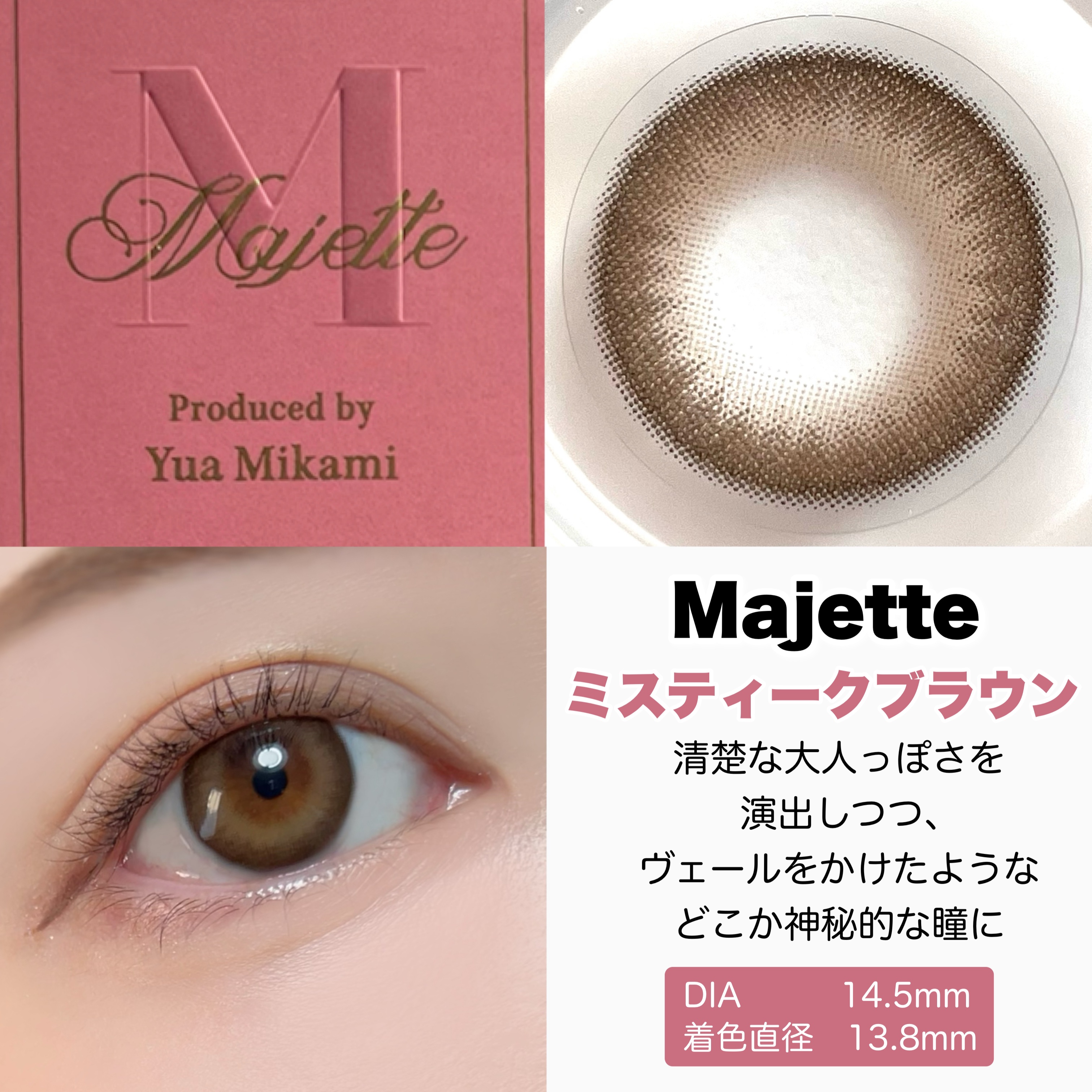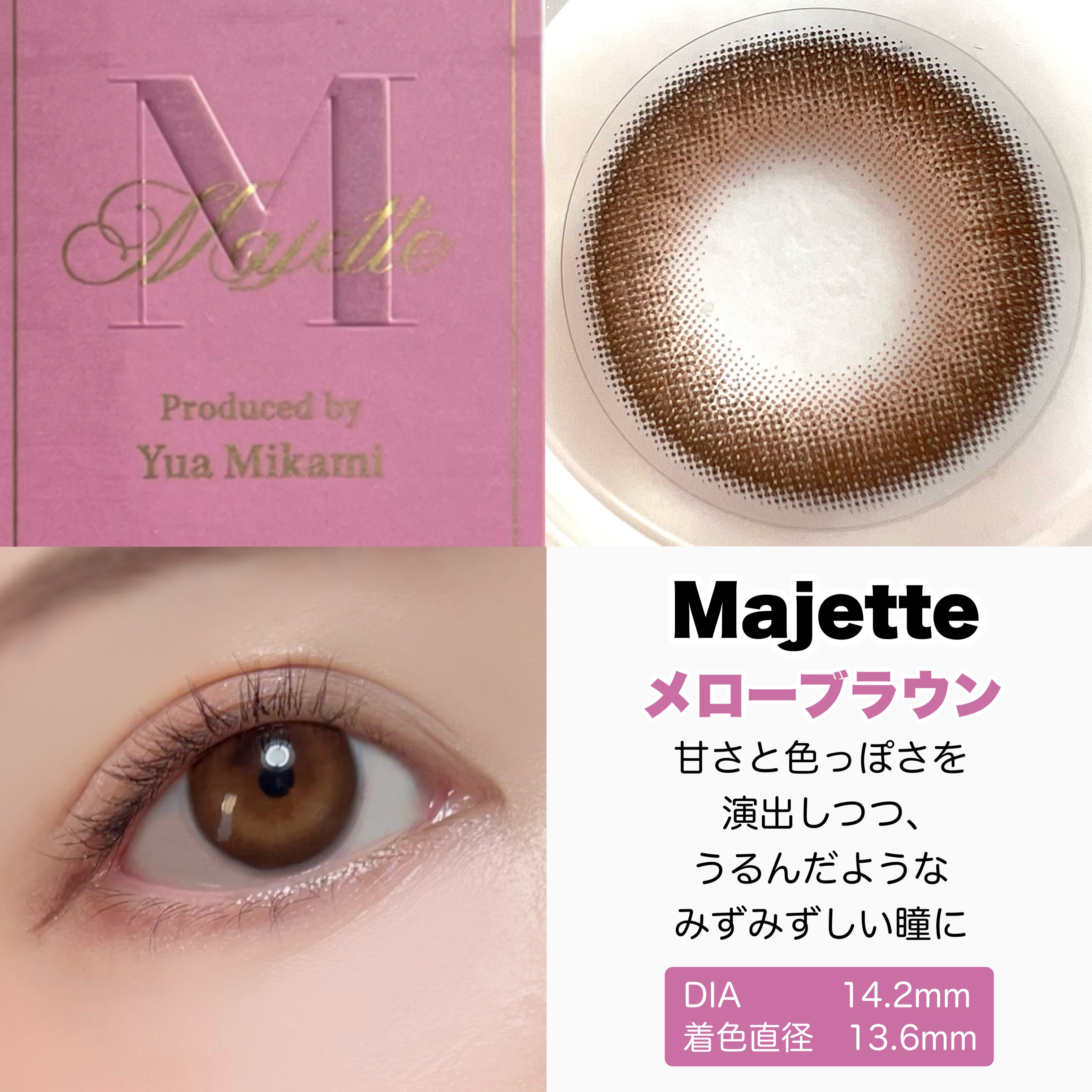 - エレガントに盛れる、瞳に纏うドレス「Majette(マジェット)」 瞳の美シルエットが叶うレディなカラコン ※度数展開はカラーパターン毎に異なりますので、ご注意ください。 ※「ミスティークブラウン」「メローブラウン」の仕様違い(DIA14.2・着色直径13.6)の商品はメーカー公式通販限定となっておりLIPSではお取り扱いがございません。 カラーコンタクトレンズの不適正使用による眼障害の危険性等などがあります。 ●コンタクトレンズは高度管理医療機器です。不十分な洗浄・消毒など不適切なケアや、長時間・交換期間を超えた装用により、アレルギー性結膜炎、角膜感染症、角膜潰瘍等の重篤な眼障害が発生する危険性があります ●ご使用前に取扱説明書を確認してください 使用上の留意事項 ●眼科医院等を受診してからお求めください ●眼に異常を感じたら直ちにレンズ使用を中止し、お近くの眼科等で診察を受けてください ●医師の指示にしたがってご使用ください ●コンタクトレンズを装用する場合、自覚症状がなくても、眼科医院等での定期検査を受けてください ●レンズに不具合がある場合は使用しないでください