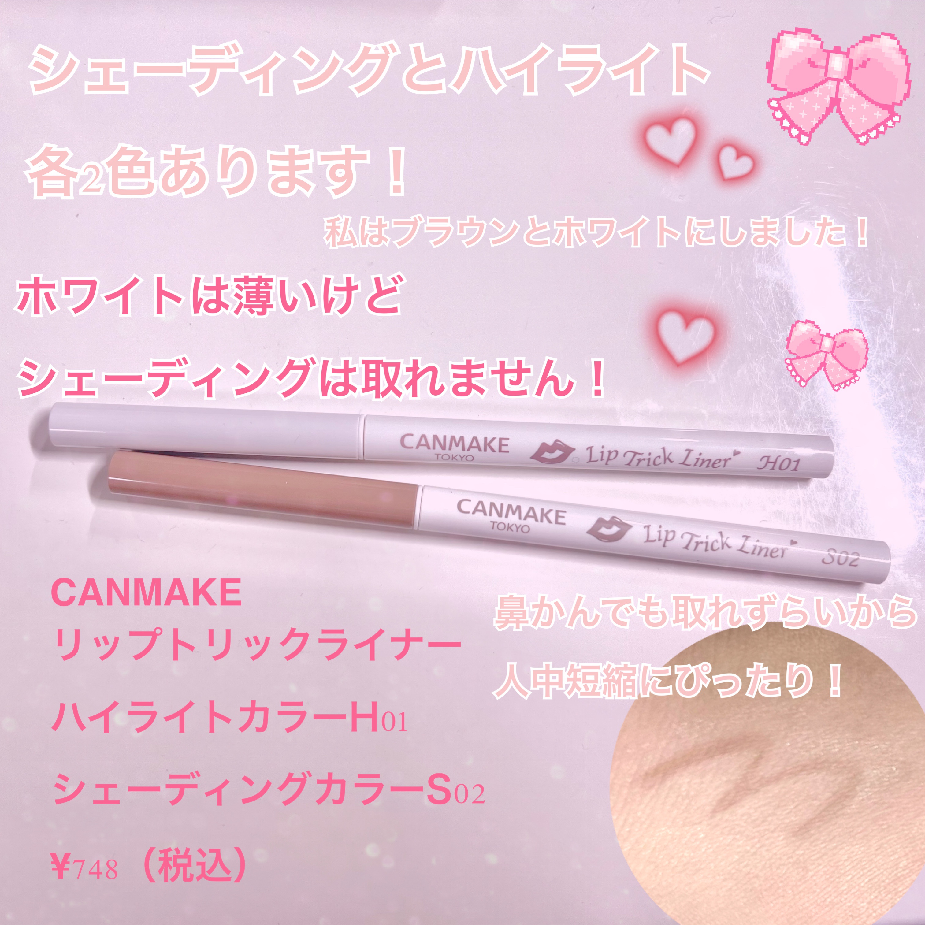 発色は淡くてあんまり使った前後で違いがわかりにくいので調整しやすいです! パウダーをブラシでつけると広く着けすぎたりしちゃいますがこれはピンポイントで塗れます! S02は馴染みのいいブラウンカラーで唇の影とか人中短縮に使いやすいと思いました! キャンメイクのアイライナーより硬めに作られてる印象があるのでそこだけ気をつけて使ってます!