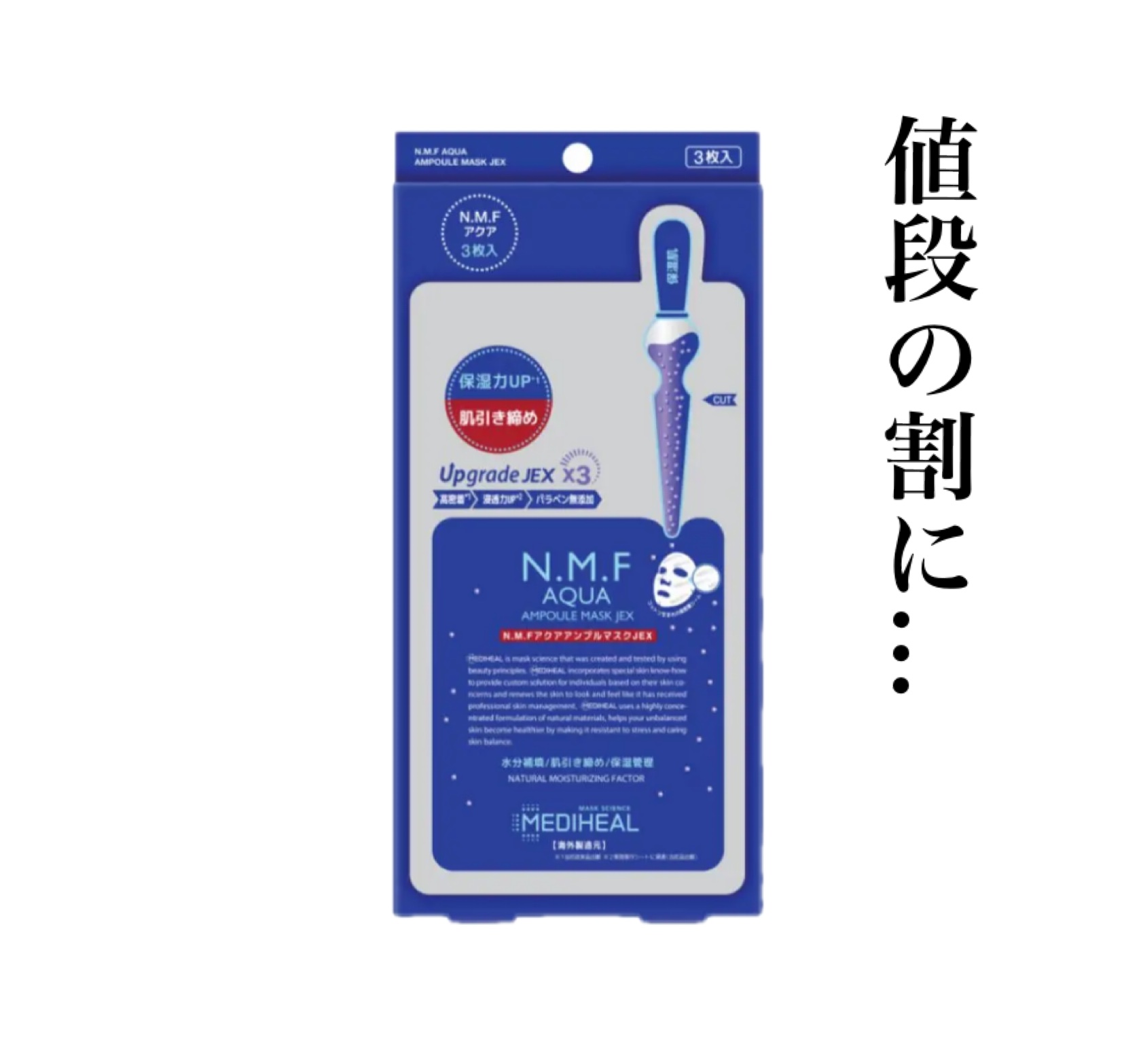 MEDIHEALのN.M.FアクアアンプルマスクJEX(Jと書いてあるのは日本版、だそう)。とにかくマスクシートが好き!!顔のサイズにちょうど良い!!目周りも、おでこも、顎も。日本人の顔の形にあわせてくれたのかなと。シートにブランドロゴが書い...