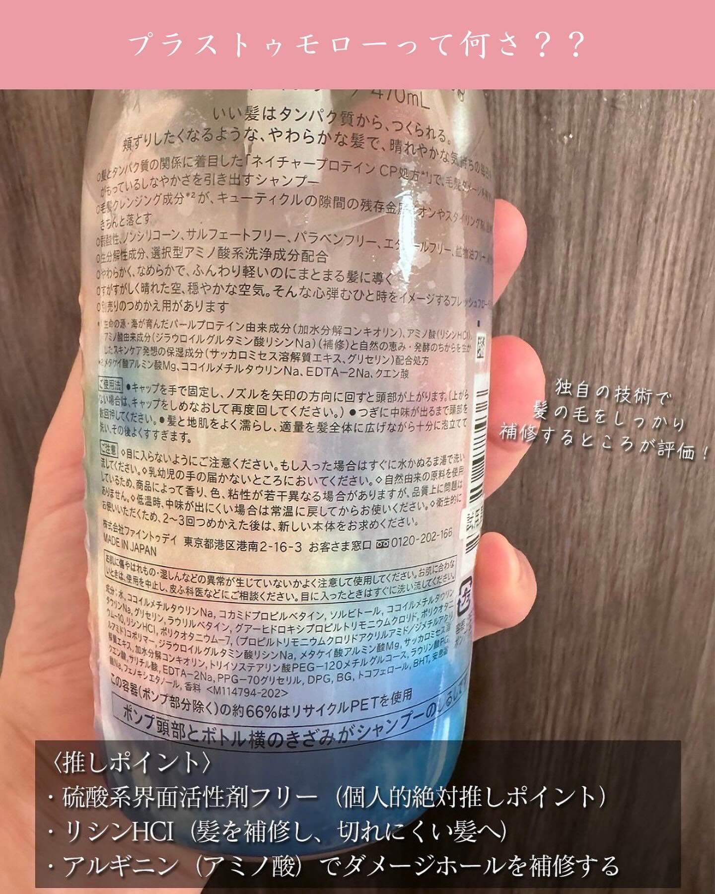 うねりやパサつきなど、髪悩みの一因はタンパク質の流出。 髪の約80%以上はタンパク質でできているけど、ダメージを受けた髪はタンパク質が流出して穴ぼこ状態なんだって。 プラストゥモローはタンパク質に着目したヘアケア。「ネイチャープロテインMCP処方*」でダメージを補修し、髪本来がもっているしなやかさを引き出してくれるそう。 シャンプーはゆたかな泡立ちで髪をやわらかく包みこんで洗えるよ。 トリートメントはゆるめのとろりとしたテクスチャーで髪のすみずみまで行き渡りやすい。