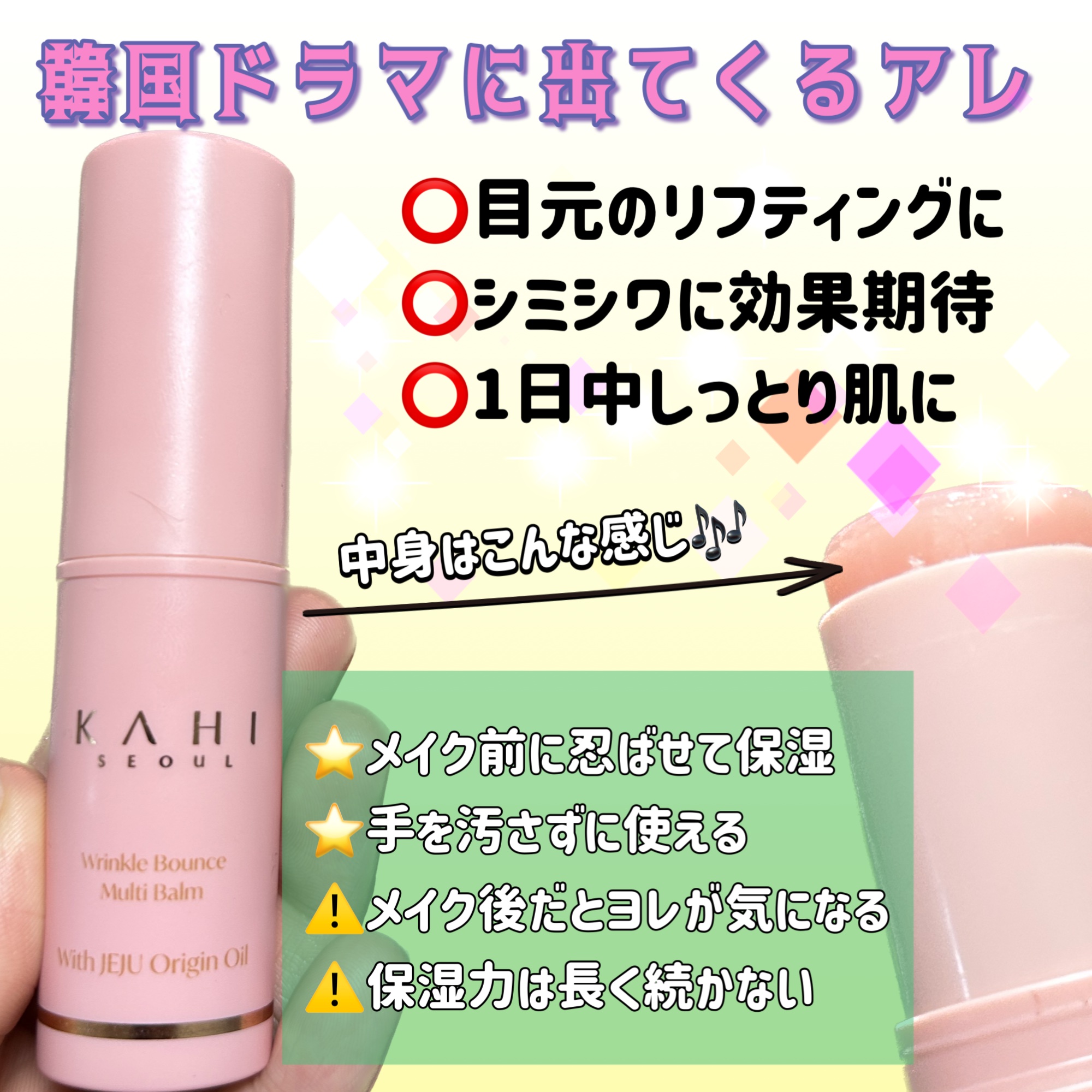 韓国ドラマから火がついた(?)❤️🔥 スティックで使いやすいマルチバームです! 乾燥やシワが気になるところにおすすめとのこと。夕方化粧崩れが気になる部分に塗っても良さそうですし、塗るとツヤツヤになるのでちょっとしたハイライト代わりにもなりそうです。 保湿されるがゆえ、サラサラにはならずベタベタした感じは残ります。
