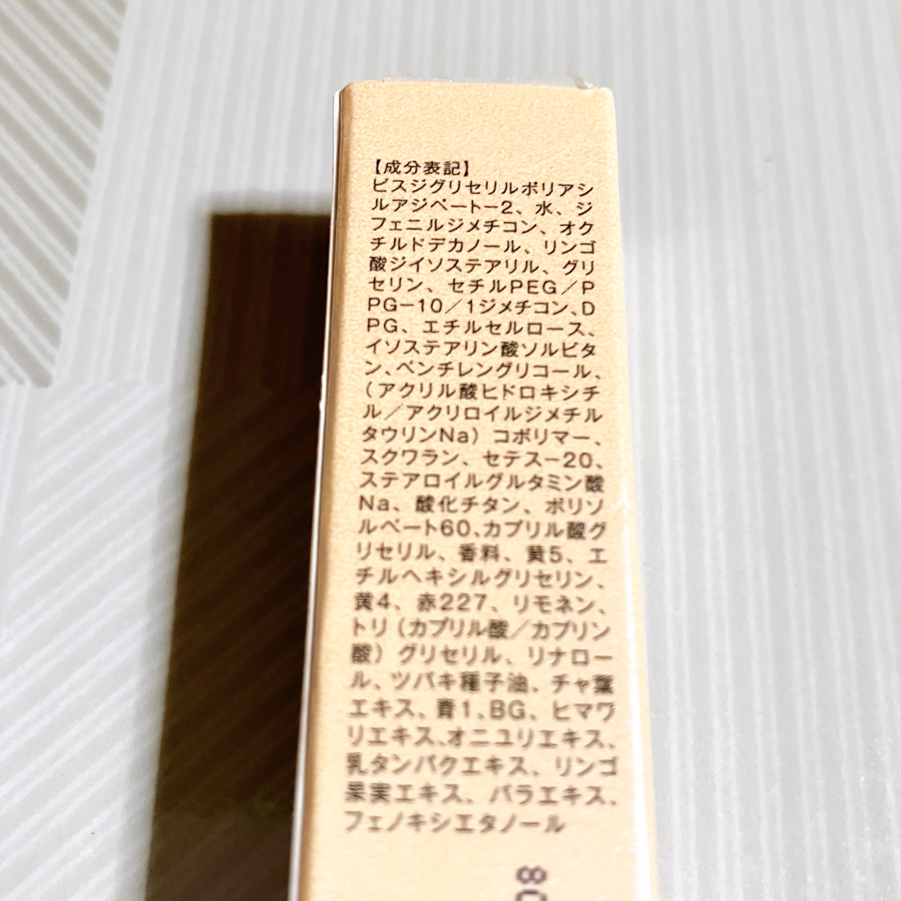 - <01 珊瑚ピンク> ビスジグリセリルポリアシルアジペート-2、水、ジフェニルジメチコン、オクチルドデカノール、リンゴ酸ジイソステアリル、グリセリン、セチルPEG/PPG-10/1ジメチコン、DPG、エチルセルロース、イソステアリン酸ソルビタン、ペンチレングリコール、(アクリル酸ヒドロキシエチル/アクリロイルジメチルタウリンNa)コポリマー、スクワラン、セテス-20、ステアロイルグルタミン酸Na、酸化チタン、ポリソルベート60、カプリル酸グリセリル、香料、黄5、エチルヘキシルグリセリン、黄4、赤227、リモネン、トリ(カプリル酸/カプリン酸)グリセリル、リナロール、ツバキ種子油、チャ葉エキス、青1、BG、ヒマワリエキス、オニユリエキス、乳タンパクエキス、リンゴ果実エキス、バラエキス、フェノキシエタノール <02 珊瑚ローズ> ビスジグリセリルポリアシルアジペート-2、水、ジフェニルジメチコン、オクチルドデカノール、リンゴ酸ジイソステアリル、グリセリン、セチルPEG/PPG-10/1ジメチコン、DPG、エチルセルロース、イソステアリン酸ソルビタン、ペンチレングリコール、(アクリル酸ヒドロキシエチル/アクリロイルジメチルタウリンNa)コポリマー、スクワラン、酸化チタン、セテス-20、ステアロイルグルタミン酸Na、黄5、ポリソルベート60、カプリル酸グリセリル、香料、エチルヘキシルグリセリン、赤227、赤104(1)、黄4、リモネン、青1、トリ(カプリル酸/カプリン酸)グリセリル、リナロール、ツバキ種子油、チャ葉エキス、BG、ヒマワリエキス、オニユリエキス、乳タンパクエキス、バラエキス、リンゴ果実エキス、フェノキシエタノール <03 珊瑚ブラウン> ビスジグリセリルポリアシルアジペート-2、水、ジフェニルジメチコン、オクチルドデカノール、リンゴ酸ジイソステアリル、グリセリン、セチルPEG/PPG-10/1ジメチコン、DPG、エチルセルロース、イソステアリン酸ソルビタン、ペンチレングリコール、(アクリル酸ヒドロキシエチル/アクリロイルジメチルタウリンNa)コポリマー、スクワラン、酸化チタン、セテス-20、ステアロイルグルタミン酸Na、黄5、ポリソルベート60、カプリル酸グリセリル、香料、赤227、エチルヘキシルグリセリン、赤104(1)、黄4、リモネン、青1、トリ(カプリル酸/カプリン酸)グリセリル、リナロール、ツバキ種子油、チャ葉エキス、BG、ヒマワリエキス、オニユリエキス、乳タンパクエキス、バラエキス、リンゴ果実エキス、フェノキシエタノール <04 無花果ベージュ> ビスジグリセリルポリアシルアジペート-2、水、ジフェニルジメチコン、オクチルドデカノール、リンゴ酸ジイソステアリル、グリセリン、セチルPEG/PPG-10/1ジメチコン、DPG、エチルセルロース、イソステアリン酸ソルビタン、ペンチレングリコール、(アクリル酸ヒドロキシエチル/アクリロイルジメチルタウリンNa)コポリマー、スクワラン、ステアロイルグルタミン酸Na、セテス-20、酸化チタン、黄4、黄5、ポリソルベート60、カプリル酸グリセリル、香料、赤227、エチルヘキシルグリセリン、リモネン、青1、トリ(カプリル酸/カプリン酸)グリセリル、リナロール、ツバキ種子油、チャ葉エキス、BG、ヒマワリエキス、オニユリエキス、乳タンパクエキス、バラエキス、リンゴ果実エキス、フェノキシエタノール <05 無花果ブラウン> ビスジグリセリルポリアシルアジペート-2、水、ジフェニルジメチコン、オクチルドデカノール、リンゴ酸ジイソステアリル、グリセリン、セチルPEG/PPG-10/1ジメチコン、DPG、エチルセルロース、イソステアリン酸ソルビタン、ペンチレングリコール、(アクリル酸ヒドロキシエチル/アクリロイルジメチルタウリンNa)コポリマー、スクワラン、ステアロイルグルタミン酸Na、セテス-20、酸化チタン、黄5、ポリソルベート60、カプリル酸グリセリル、香料、赤227、エチルヘキシルグリセリン、黄4、青1 リモネン、トリ(カプリル酸/カプリン酸)グリセリル、リナロール、ツバキ種子油、チャ葉エキス、BG、ヒマワリエキス、オニユリエキス、乳タンパクエキス、バラエキス、リンゴ果実エキス、フェノキシエタノール <06 恋の花束ピンク> ビスジグリセリルポリアシルアジペート-2、水、ジフェニルジメチコン、オクチルドデカノール、リンゴ酸ジイソステアリル、グリセリン、セチルPEG/PPG-10/1ジメチコン、DPG、エチルセルロース、イソステアリン酸ソルビタン、ペンチレングリコール、酸化チタン、(アクリル酸ヒドロキシエチル/アクリロイルジメチルタウリンNa)コポリマー、スクワラン、セテアレス-20、ステアロイルグルタミン酸Na、マイカ、ポリソルベート60、カプリル酸グリセリル、香料、赤227、エチルヘキシルグリセリン、黄4、黄5、水酸化Al、ポリアクリル酸アンモニウム、リモネン、BG、フェノキシエタノール、青1、トリ(カプリル酸/カプリン酸)グリセリル、酸化スズ、リナロール、ツバキ種子油、チャ葉エキス、ヒマワリエキス、オニユリエキス、乳タンパクエキス、バラエキス、リンゴ果実エキス <07 