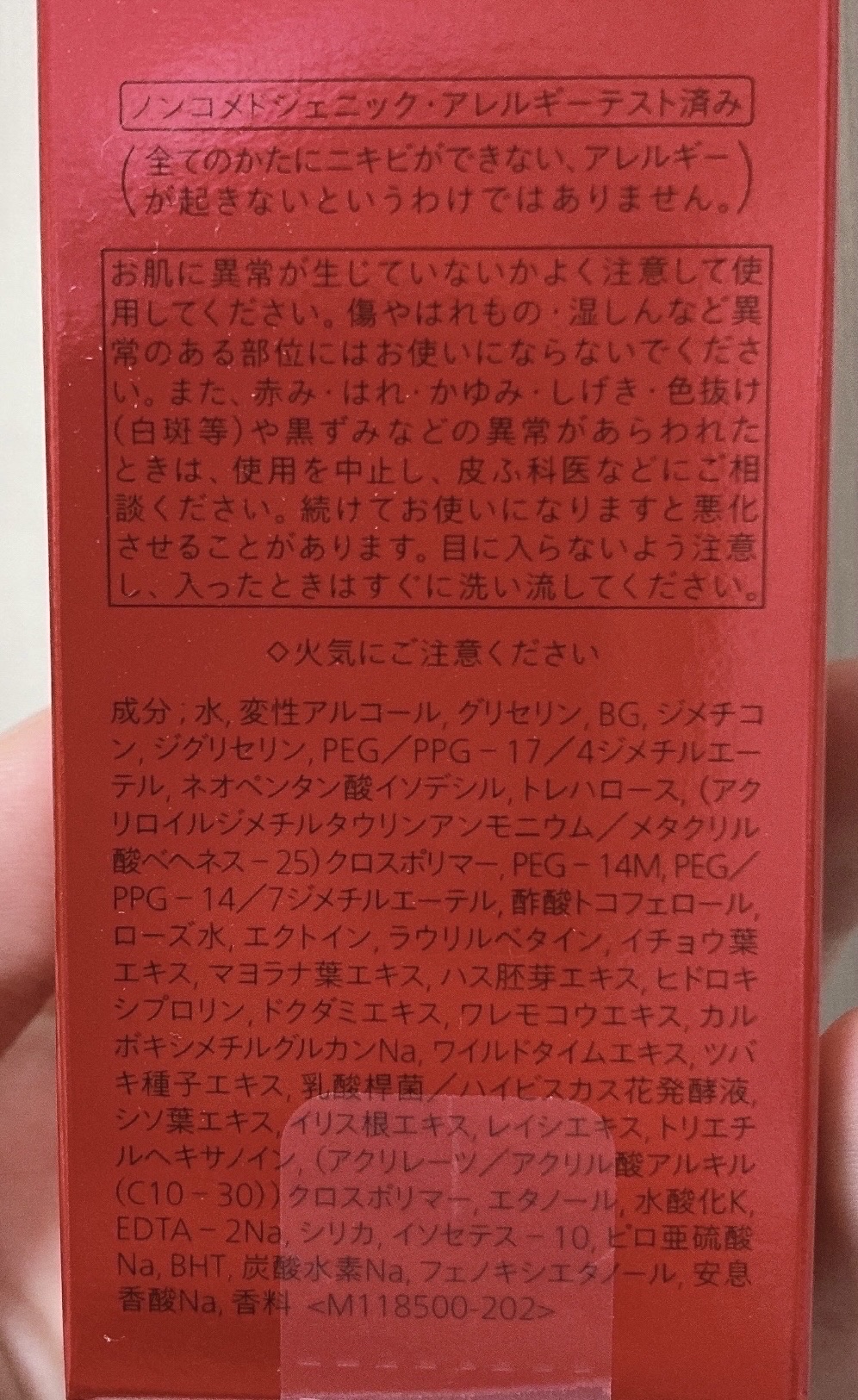 - <50ml> 水、変性アルコール、グリセリン、BG、ジメチコン、ジグリセリン、PEG/PPG-17/4ジメチルエーテル、ネオペンタン酸イソデシル、トレハロース、(アクリロイルジメチルタウリンアンモニウム/メタクリル酸ベヘネス-25)クロスポリマー、PEG-14M、PEG/PPG-14/7ジメチルエーテル、酢酸トコフェロール、ローズ水、エクトイン、ラウリルベタイン、イチョウ葉エキス、マヨラナ葉エキス、ハス胚芽エキス、ヒドロキシプロリン、ドクダミエキス、ワレモコウエキス、カルボキシメチルグルカンNa、ワイルドタイムエキス、ツバキ種子エキス、乳酸桿菌/ハイビスカス花発酵液、シソ葉エキス、イリス根エキス、レイシエキス、トリエチルヘキサノイン、(アクリレーツ/アクリル酸アルキル(C10-30))クロスポリマー、エタノール、水酸化K、EDTA-2Na、シリカ、イソセテス-10、ピロ亜硫酸Na、BHT、炭酸水素Na、フェノキシエタノール、安息香酸Na、香料 <30ml> 水、変性アルコール、グリセリン、BG、ジメチコン、ジグリセリン、PEG/PPG-17/4ジメチルエーテル、ネオペンタン酸イソデシル、トレハロース、(アクリロイルジメチルタウリンアンモニウム/メタクリル酸ベヘネス-25)クロスポリマー、PEG-14M、PEG/PPG-14/7ジメチルエーテル、酢酸トコフェロール、ローズ水、エクトイン、ラウリルベタイン、イチョウ葉エキス、マヨラナ葉エキス、ハス胚芽エキス、ヒドロキシプロリン、ドクダミエキス、ワレモコウエキス、カルボキシメチルグルカンNa、ワイルドタイムエキス、ツバキ種子エキス、乳酸桿菌/ハイビスカス花発酵液、シソ葉エキス、イリス根エキス、レイシエキス、トリエチルヘキサノイン、(アクリレーツ/アクリル酸アルキル(C10-30))クロスポリマー、エタノール、水酸化K、EDTA-2Na、シリカ、イソセテス-10、ピロ亜硫酸Na、BHT、炭酸水素Na、フェノキシエタノール、安息香酸Na、香料 <50ml(レフィル)> 水、変性アルコール、グリセリン、BG、ジメチコン、ジグリセリン、PEG/PPG-17/4ジメチルエーテル、ネオペンタン酸イソデシル、トレハロース、(アクリロイルジメチルタウリンアンモニウム/メタクリル酸ベヘネス-25)クロスポリマー、PEG-14M、PEG/PPG-14/7ジメチルエーテル、酢酸トコフェロール、ローズ水、エクトイン、ラウリルベタイン、イチョウ葉エキス、マヨラナ葉エキス、ハス胚芽エキス、ヒドロキシプロリン、ドクダミエキス、ワレモコウエキス、カルボキシメチルグルカンNa、ワイルドタイムエキス、ツバキ種子エキス、乳酸桿菌/ハイビスカス花発酵液、シソ葉エキス、イリス根エキス、レイシエキス、トリエチルヘキサノイン、(アクリレーツ/アクリル酸アルキル(C10-30))クロスポリマー、エタノール、水酸化K、EDTA-2Na、シリカ、イソセテス-10、ピロ亜硫酸Na、BHT、炭酸水素Na、フェノキシエタノール、安息香酸Na、香料 <75mL <数量限定品>> 水、変性アルコール、グリセリン、BG、ジメチコン、ジグリセリン、PEG/PPG-17/4ジメチルエーテル、ネオペンタン酸イソデシル、トレハロース、(アクリロイルジメチルタウリンアンモニウム/メタクリル酸ベヘネス-25)クロスポリマー、PEG-14M、PEG/PPG-14/7ジメチルエーテル、酢酸トコフェロール、ローズ水、エクトイン、ラウリルベタイン、イチョウ葉エキス、マヨラナ葉エキス、ハス胚芽エキス、ヒドロキシプロリン、ドクダミエキス、ワレモコウエキス、カルボキシメチルグルカンNa、ワイルドタイムエキス、ツバキ種子エキス、乳酸桿菌/ハイビスカス花発酵液、シソ葉エキス、イリス根エキス、レイシエキス、トリエチルヘキサノイン、(アクリレーツ/アクリル酸アルキル(C10-30))クロスポリマー、エタノール、水酸化K、EDTA-2Na、シリカ、イソセテス-10、ピロ亜硫酸Na、BHT、炭酸水素Na、フェノキシエタノール、安息香酸Na、香料 <リミテッドエディション 75mL> 水、変性アルコール、グリセリン、BG、ジメチコン、ジグリセリン、PEG/PPG-17/4ジメチルエーテル、ネオペンタン酸イソデシル、トレハロース、(アクリロイルジメチルタウリンアンモニウム/メタクリル酸ベヘネス-25)クロスポリマー、PEG-14M、PEG/PPG-14/7ジメチルエーテル、酢酸トコフェロール、ローズ水、エクトイン、ラウリルベタイン、イチョウ葉エキス、マヨラナ葉エキス、ハス胚芽エキス、ヒドロキシプロリン、ドクダミエキス、ワレモコウエキス、カルボキシメチルグルカンNa、ワイルドタイムエキス、ツバキ種子エキス、乳酸桿菌/ハイビスカス花発酵液、シソ葉エキス、イリス根エキス、レイシエキス、トリエチルヘキサノイン、(アクリレーツ/アクリル酸アルキル(C10-30))クロスポリマー、エタノール、水酸化K、EDTA-2Na、シリカ、イソセテス-10、ピロ亜硫酸Na、BHT、炭酸水素Na、フェノキシエタノール、安息香酸Na、香料
