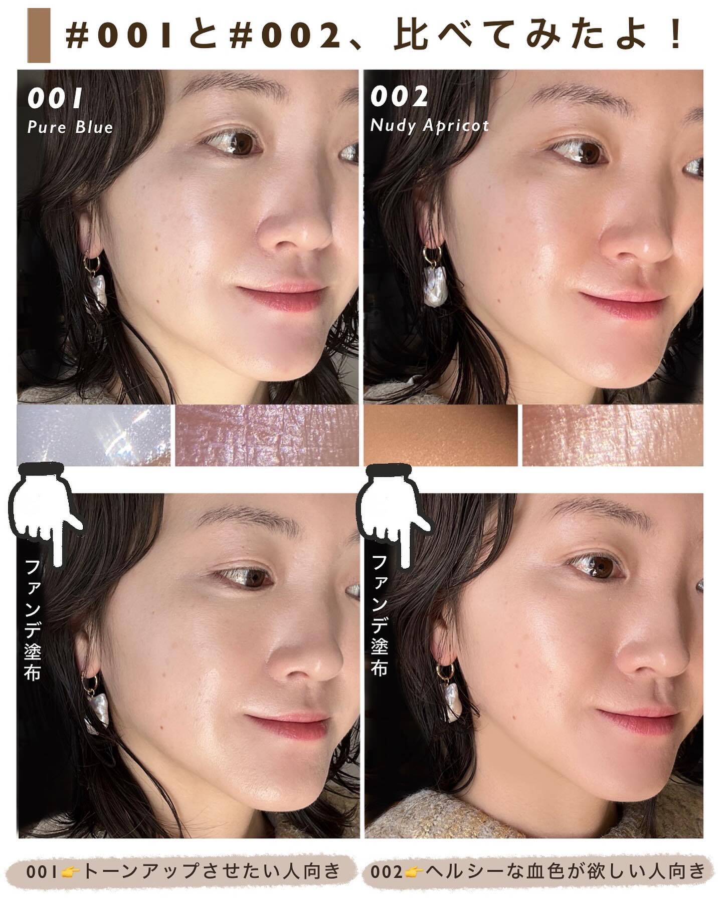 - <001 Pure Blue > 水、BG、メトキシケイヒ酸エチルヘキシル、ジカプリン酸PG、イソノナン酸イソトリデシル、メチレンビスベンゾトリアゾリルテトラメチルブチルフェノール、グリセリン、ジエチルアミノヒドロキシベンゾイル安息香酸ヘキシル、ビスエチルヘキシルオキシフェノールメトキシフェニルトリアジン、ポリシリコーン-15、ステアリン酸、TEA、オリーブ果実油、カニナバラ果実油、ゴマ種子油、サフラワー油、ジパルミチン酸アスコルビル、テトラヘキシルデカン酸アスコルビル、トコフェロール、ホホバ種子油、ラベンダー油、BHT、EDTA-2Na、PEG-10水添ヒマシ油、(アクリル酸Na/アクリロイルジメチルタウリンNa)コポリマー、(アクリレーツ/アクリル酸アルキル(C10-30))クロスポリマー、イソヘキサデカン、オレイン酸ソルビタン、カルボマー、キサンタンガム、シリカ、ジメチコン、ステアリン酸グリセリル、セスキオレイン酸ソルビタン、セテアリルアルコール、タルク、トリセテアレス-4リン酸、ハイドロゲンジメチコン、ヒドロキシアパタイト、ベヘニルアルコール、ポリシリコーン-14、ポリソルベート80、メチコン、ラウリン酸ポリグリセリル-10、レシチン、合成フルオロフロゴパイト、水酸化Al、水添レシチン、フェノキシエタノール、グンジョウ、マイカ、酸化チタン、酸化亜鉛、酸化鉄 <002 Nudy Apricot > 水、BG、メトキシケイヒ酸エチルヘキシル、ジカプリン酸PG、イソノナン酸イソトリデシル、メチレンビスベンゾトリアゾリルテトラメチルブチルフェノール、グリセリン、ジエチルアミノヒドロキシベンゾイル安息香酸ヘキシル、ビスエチルヘキシルオキシフェノールメトキシフェニルトリアジン、ポリシリコーン-15、ステアリン酸、TEA、オリーブ果実油、カニナバラ果実油、ゴマ種子油、サフラワー油、ジパルミチン酸アスコルビル、テトラヘキシルデカン酸アスコルビル、トコフェロール、ホホバ種子油、ラベンダー油、BHT、EDTA-2Na、PEG-10水添ヒマシ油、(アクリル酸Na/アクリロイルジメチルタウリンNa)コポリマー、(アクリレーツ/アクリル酸アルキル(C10-30))クロスポリマー、イソヘキサデカン、オレイン酸ソルビタン、カルボマー、キサンタンガム、シリカ、ジメチコン、ステアリン酸グリセリル、セスキオレイン酸ソルビタン、セテアリルアルコール、タルク、トリエチルヘキサノイン、トリセテアレス-4リン酸、ヒドロキシアパタイト、ベヘニルアルコール、ポリシリコーン-14、ポリソルベート80、ラウリン酸ポリグリセリル-10、レシチン、合成フルオロフロゴパイト、水酸化Al、水添レシチン、フェノキシエタノール、マイカ、酸化チタン、酸化亜鉛、酸化鉄