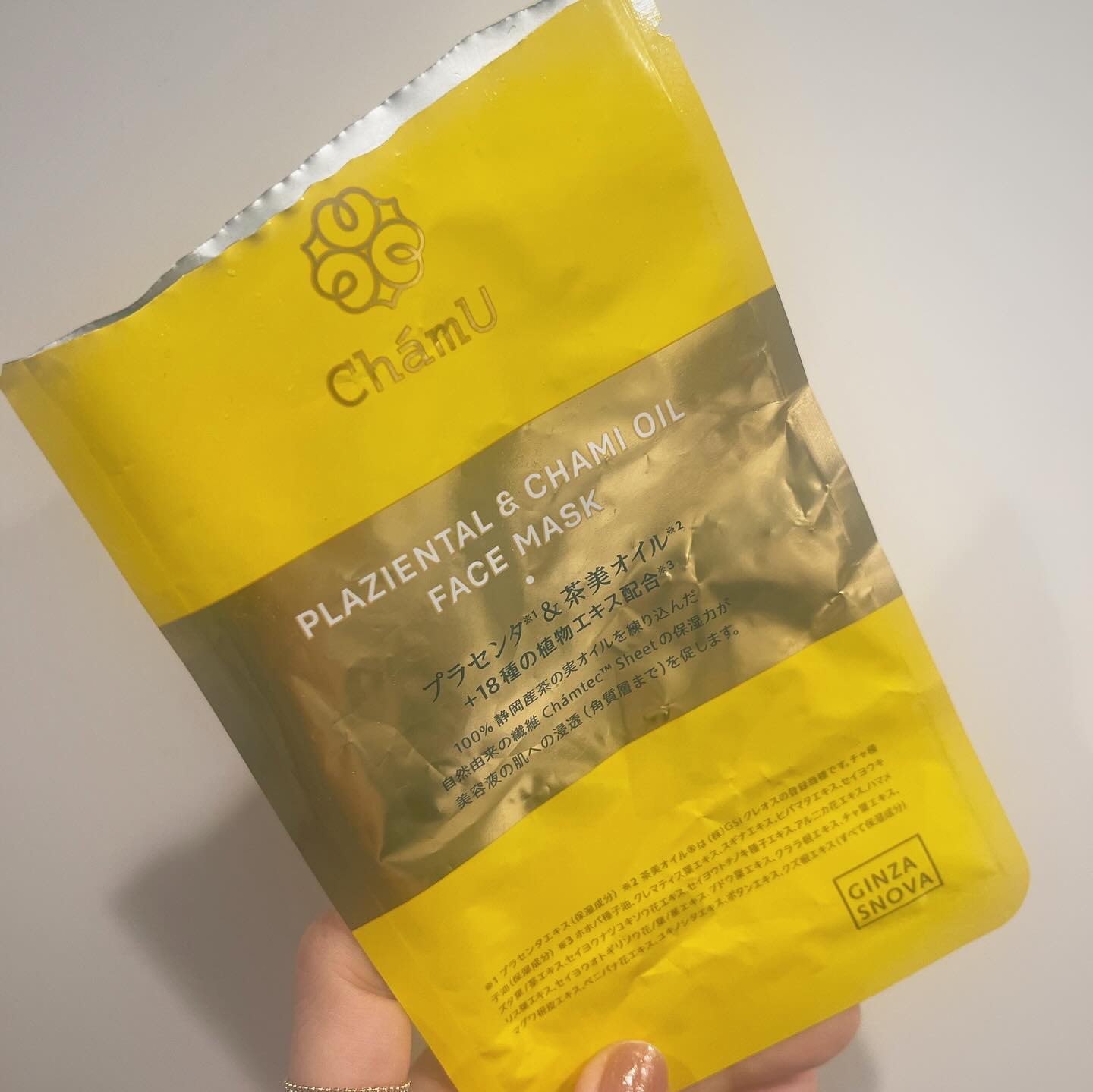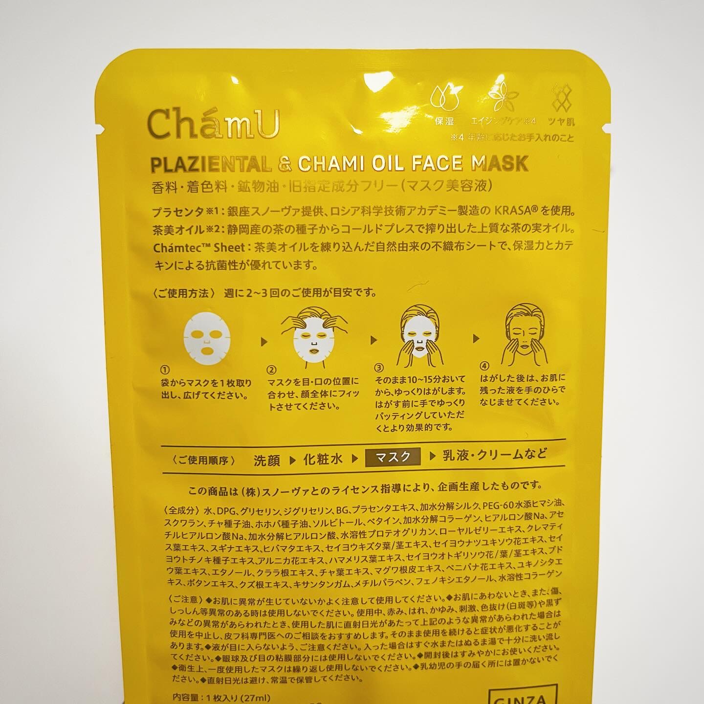 プラセンタ ティーシードオイル(コールドプレス) 18種の植物オイル ティーシードオイルはシートマスク自体にも織り込まれています🫢 ChamUのスキンケアラインはローズの香りだけど、このシートマスクは香料不使用でティーシードオイルの香ばしさもほんのり感じます🌲 シートマスクが大きめでおでこ広めの私もしっかりフィットして好きなサイズでした👌 スペシャルケアとして週2回の使用で良いから毎日スキンケアに手をかけられない人にもお勧め✨