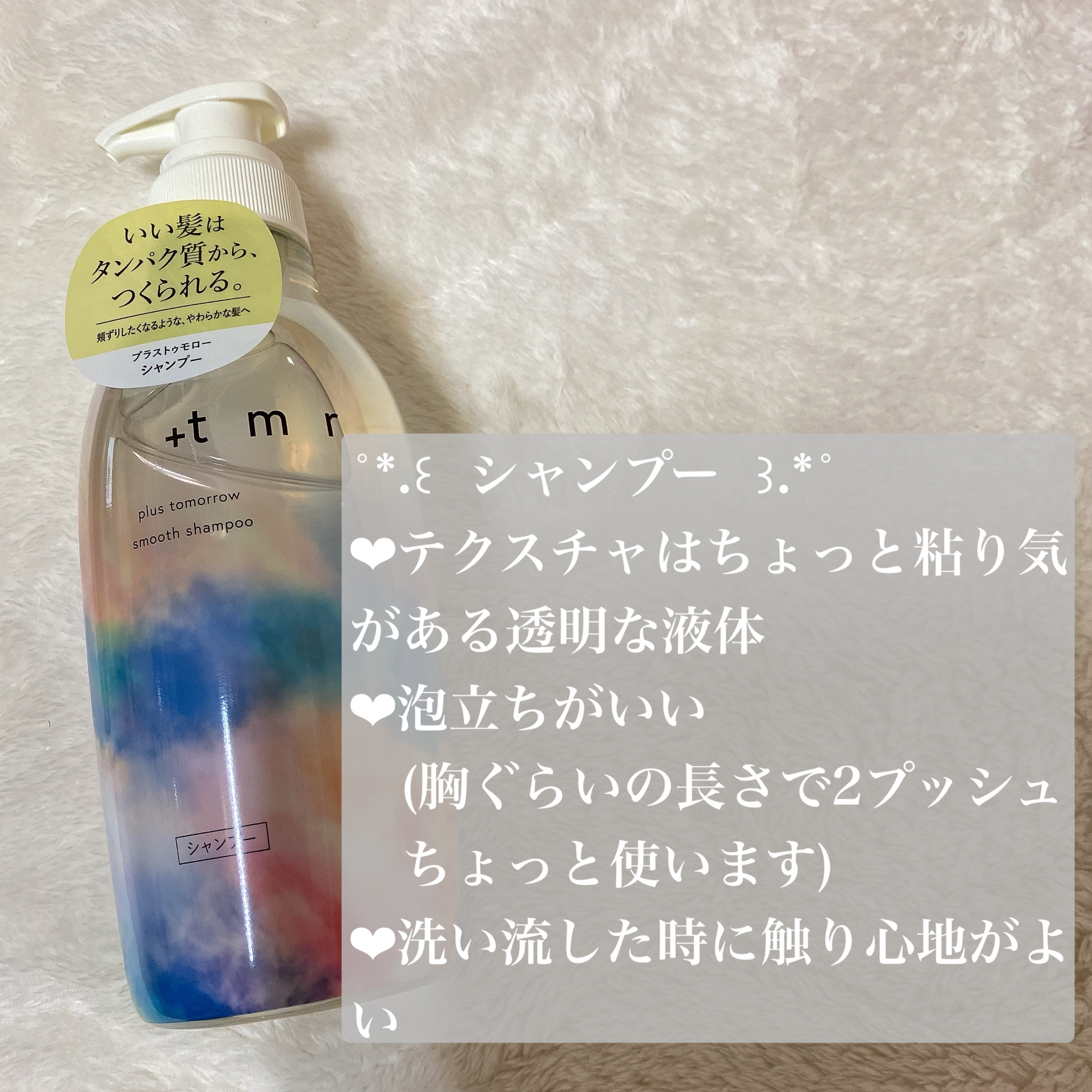 タンパク質に着目したケアの+tmr(プラストゥモロー) 髪の悩みって人それぞれ違うよね🤔 タンパク質の流出を防がないと😱+tmrはタンパク質が流出してスカスカになってしまった髪に対して、タンパク質の元となるアミノ酸でしっかり満たす◎ 泡立ちがとても良いシャンプー、たっぷりの泡で髪を包み込むように洗えます🫧
