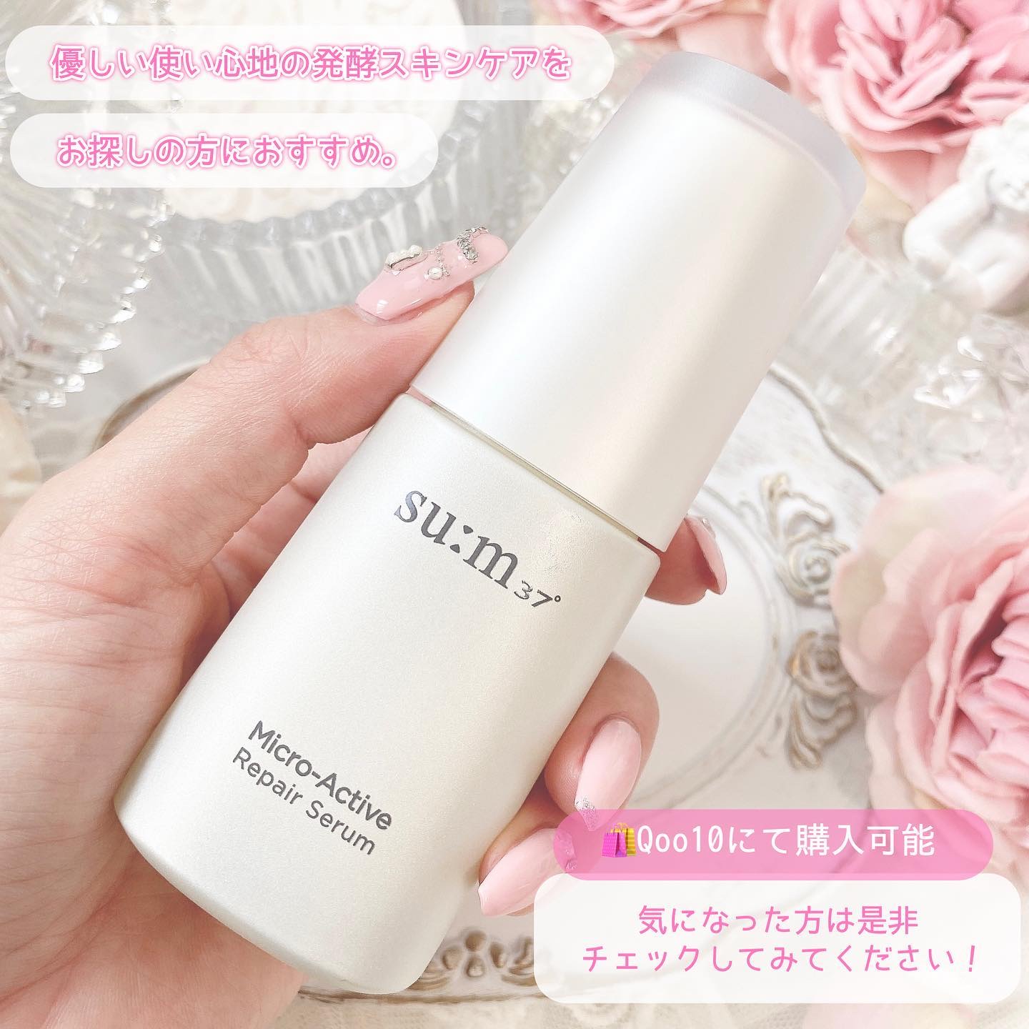 - 1つ1つを繊細に詰め込んだ10年発酵保湿成分Tru-ActiveとBiopeptide190を盛り込んだマイクロアクティブリペアセラムは生き生きとした印象であふれるような自然な艶肌に導きます。美しさの秘訣を追求するsu:m37°が見つけ出した自然・発酵の力。日々の外的刺激で敏感になった肌を繊細にケアするマイクロアクティブライン。明るい印象の輝くような肌へ。