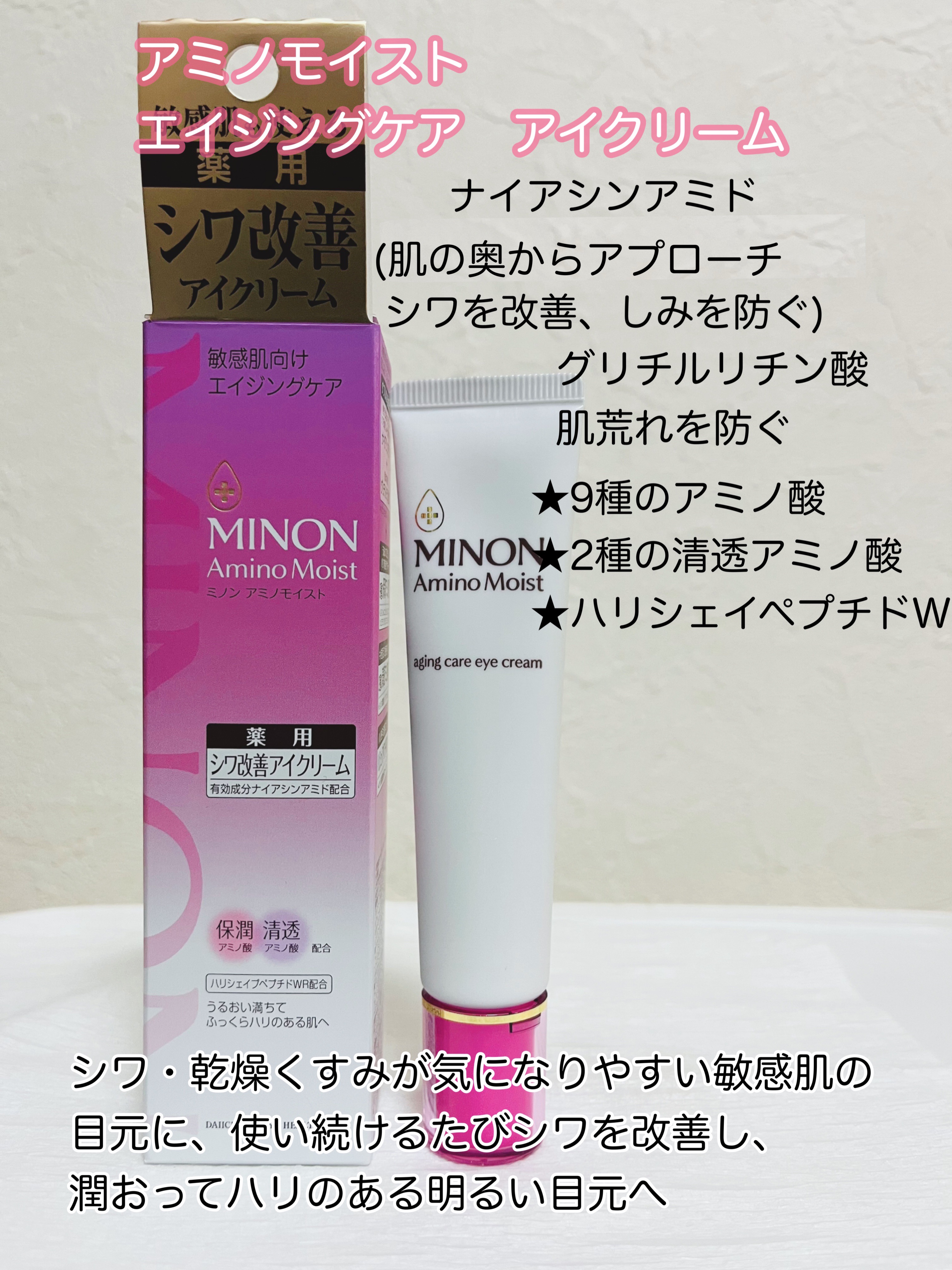 ドラストで手軽に買えるエイジングケア❤️🩹 ミノン アミノモイスト エイジングケア アイクリームのご紹介🤲 ナイアシンアミドいりなのでエイジングケアにはぴったり🌟 内容量もたっぷりなので惜しみなく使える!! エイジングケアはコツコツ貯金が大事☝️ ということで若いうちから使っておいて損はありません🤍