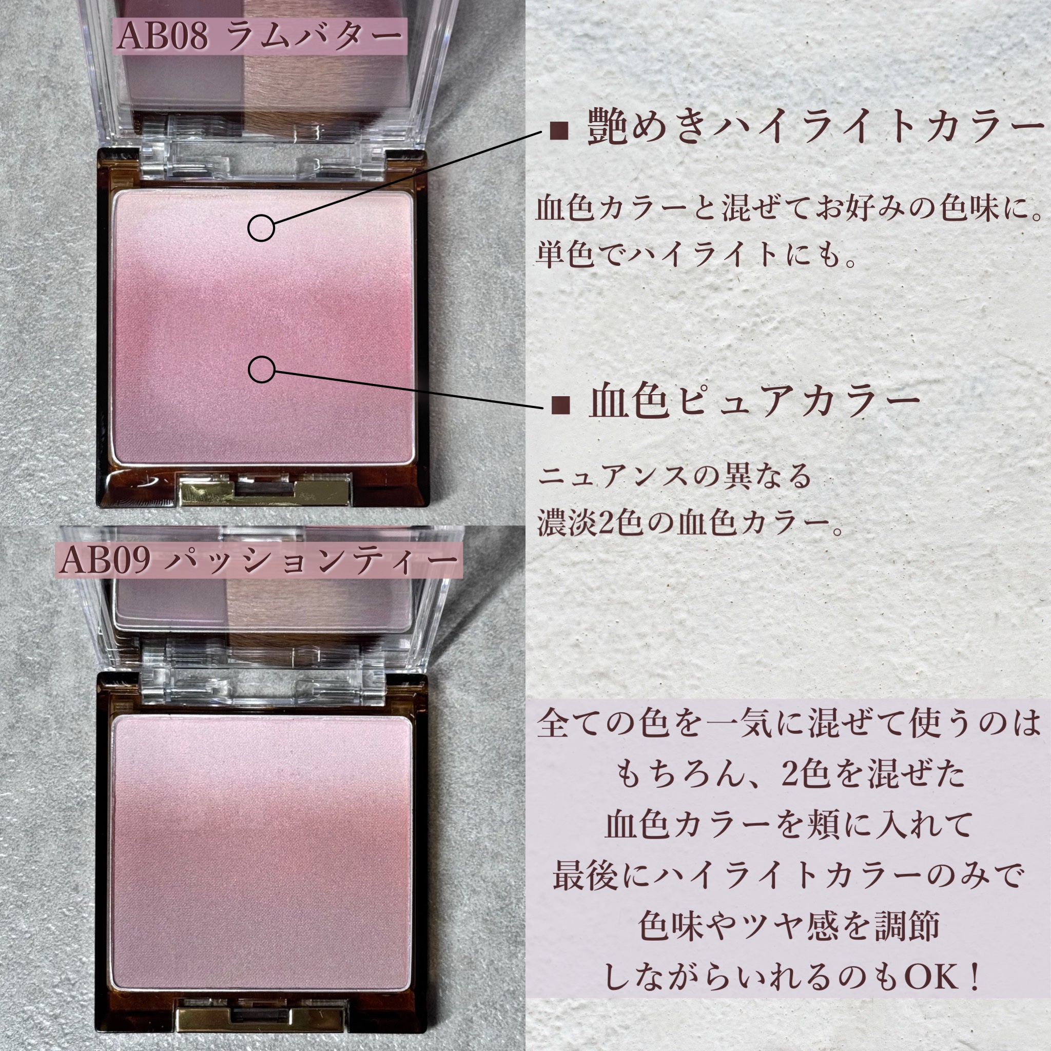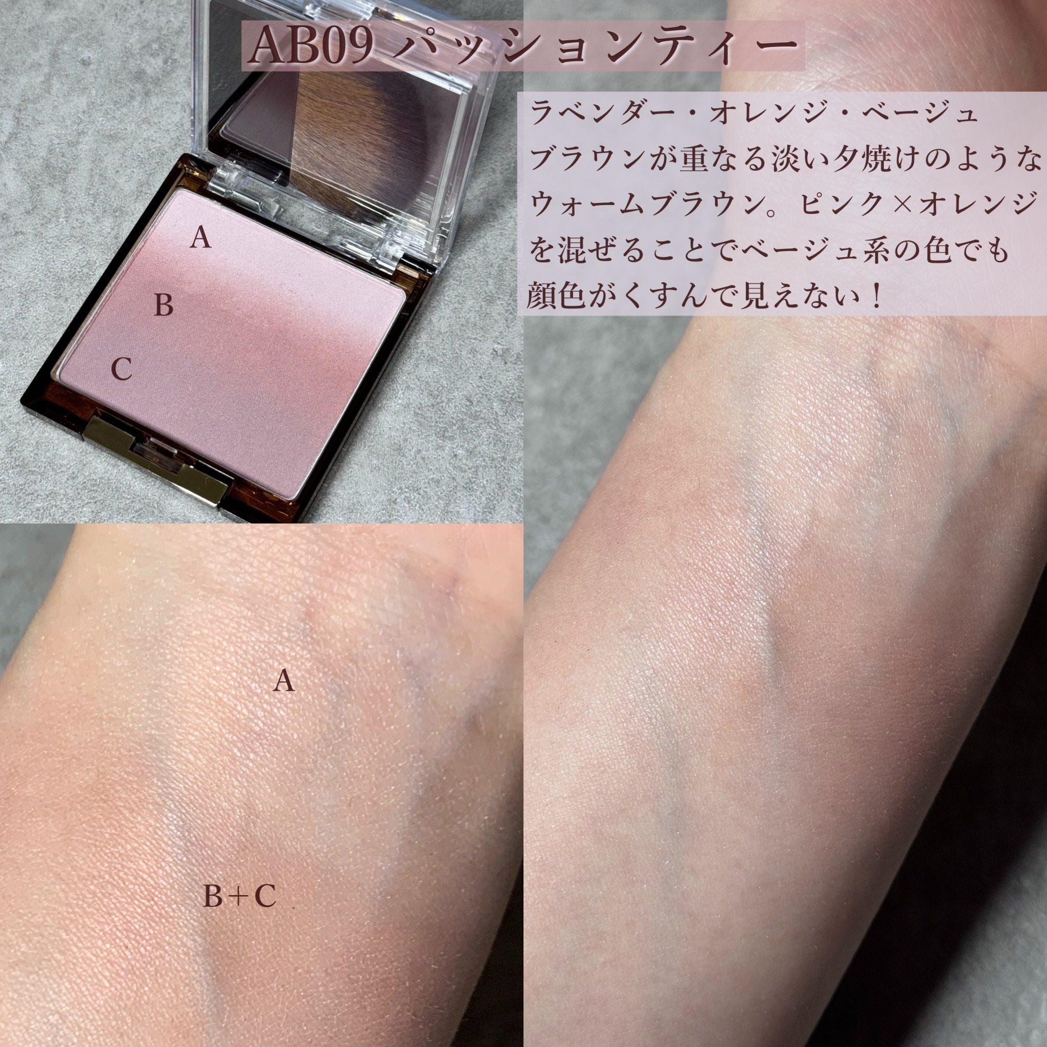 - <AB01-AB05共通> タルク、 ミリスチン酸亜鉛、 ジメチコン、 ジフェニルシロキシフェニルトリメチコン、 ワセリン、 セラミドNP、 スクワラン、 ホホバ種子油、 ブドウ種子油、 シリカ、 セスキイソステアリン酸ソルビタン、 トコフェロール、 水酸化Al、 フェノキシエタノール、 (+/-) グンジョウ、 マイカ、 黄4、 酸化チタン、 酸化鉄、 赤202、 赤226 <AB06-AB07> タルク、ミリスチン酸亜鉛、ジメチコン、ジフェニルシロキシフェニルトリメチコン、ワセリン、セラミドNP、スクワラン、ホホバ種子油、ブドウ種子油、シリカ、セスキイソステアリン酸ソルビタン、トコフェロール、水酸化Al、フェノキシエタノール、(+/-)グンジョウ、マイカ、酸化チタン、酸化鉄、赤226 <AB08-AB09> タルク、ミリスチン酸亜鉛、ジメチコン、ジフェニルシロキシフェニルトリメチコン、ワセリン、セラミドNP、スクワラン、ホホバ種子油、ブドウ種子油、シリカ、セスキイソステアリン酸ソルビタン、トコフェロール、水酸化Al、フェノキシエタノール、グンジョウ、マイカ、酸化チタン、酸化鉄、赤226、硫酸Ba