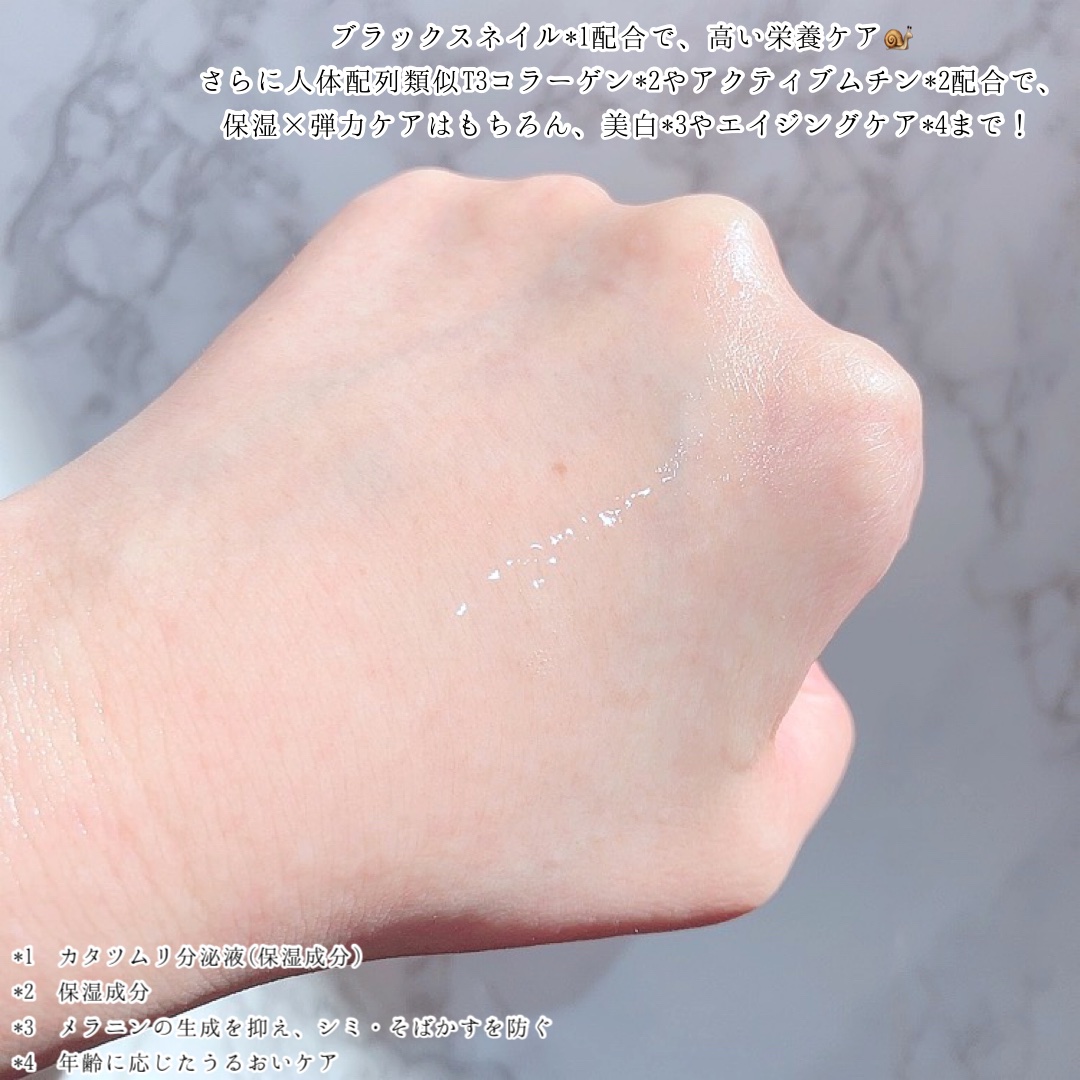 - ぷるぷるのコラーゲンゼリーが繊細ミストに変化し肌に弾力を与えるエイジングケア*1セラムミスト。 ブラックスネイル成分*2とコラーゲン*2を凝縮したゼリー状の美容液を、ミスト状にスプレーすることでお顔全体に心地よくまとうことができるセラムミスト。 ゼリーテクスチャーで潤いをキープすることで、保湿感の物足りなさをカバー。 角層の隅々から潤うことで、肌に保湿感・弾力感・フレッシュ感を与えます。 *1年齢に応じたお手入れ *2保湿成分