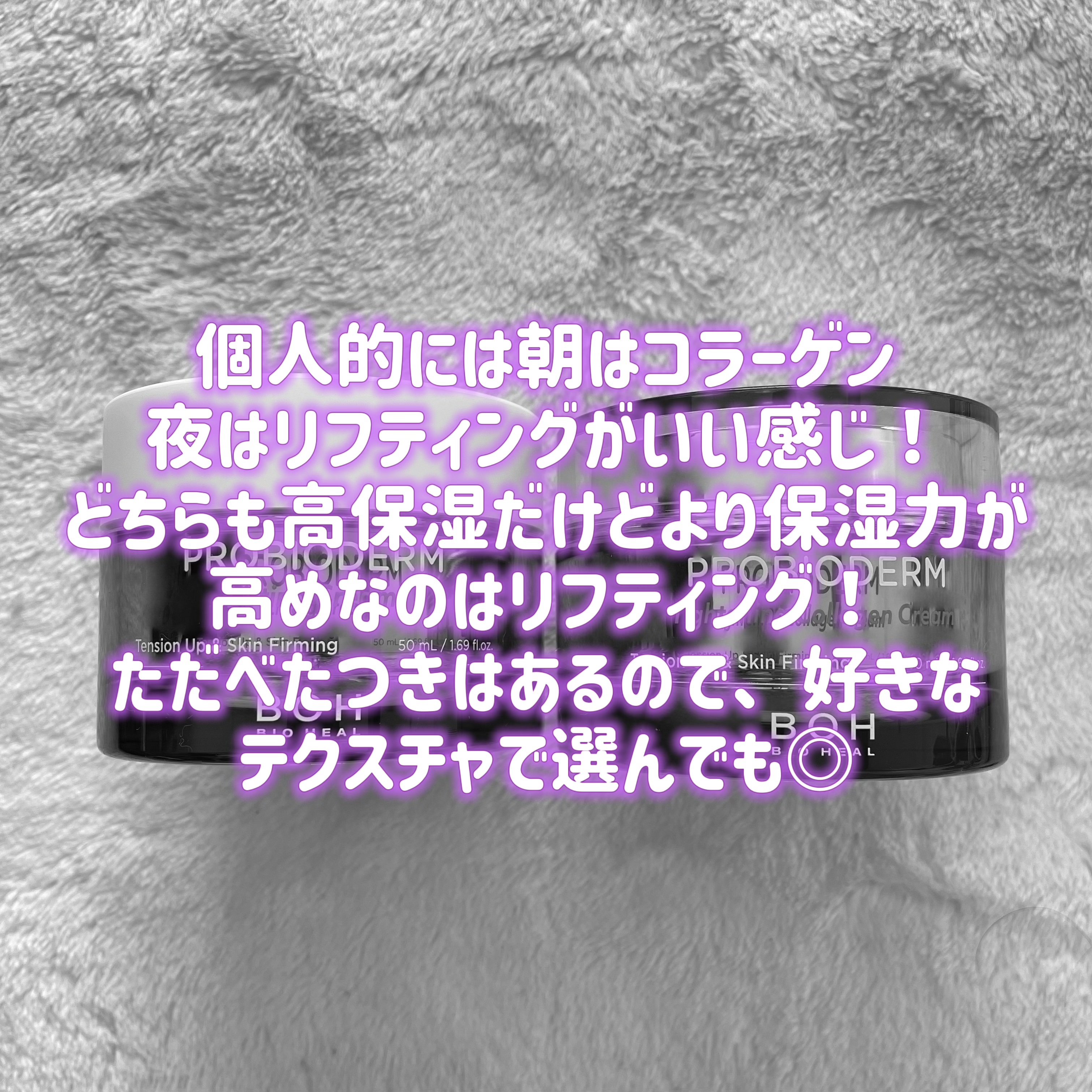 タンタンクリームの方はコッテリとしたテクスチャで、夜に使うのがおすすめのようです。保湿力も高く感じました! コラーゲンクリームの方はみずみずしいテクスチャて、中につぶつぶしたものが入っているようです。保湿力はありますが比較的さっぱりとしているので朝に使うのがおすすめのようです! 50代の母にも使ってもらったところ、保湿力には満足している様でした!