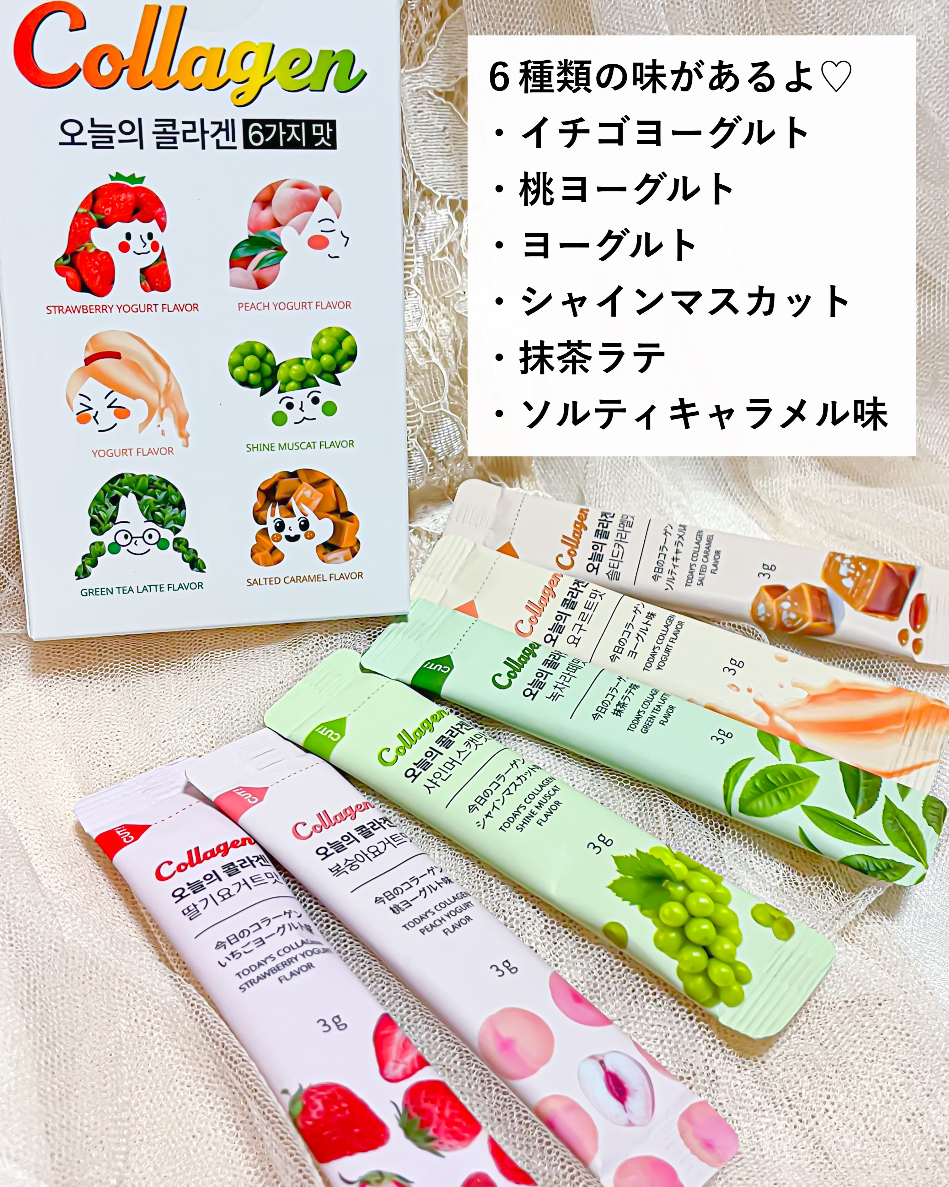 - 美味しいコラーゲンパウダー! 飲みやすいパウダーコラーゲンをお探しのあなたにおすすめします。 195daの超低分子フィッシュコラーゲンだから吸収率が高いです。 イチゴヨーグルト、桃ヨーグルト、ヨーグルト、シャインマスカット、抹茶ラテ、ソルティキャラメル味で毎日カラフルなプルプル習慣!