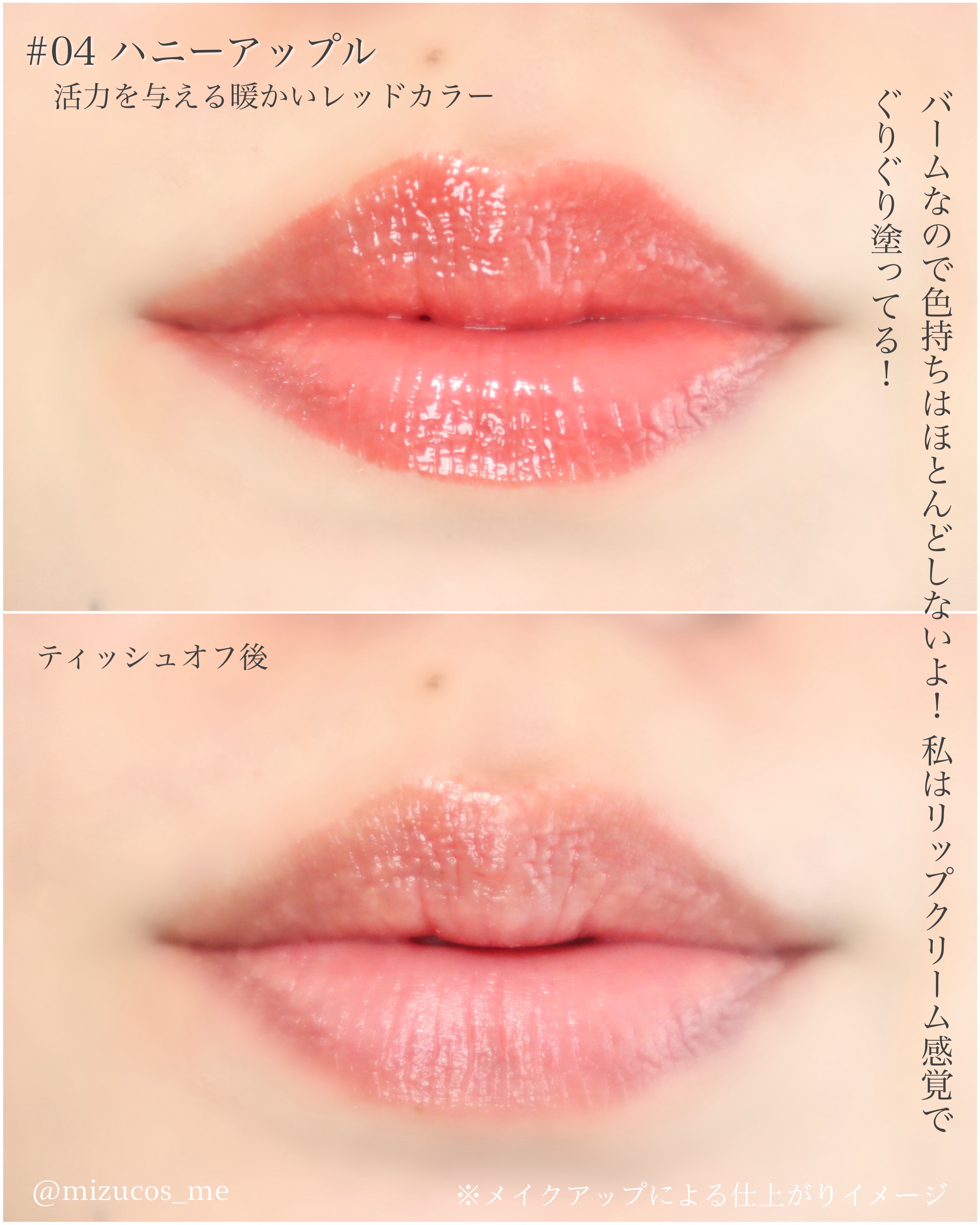 結論、なんでバズってないのか 私には理解できないくらいに良い🙆♀️ まず見た目が大優勝ね🏅 飴ちゃんみたいに透き通った色が めちゃくちゃ綺麗じゃない?? ずっと見てられる✨✨ もちろんリップとしての性能も優秀🏆 個人的にめっちゃ好きな ヒンスのムードインハンサーウォーターリキッドグロウ のむちっとした質感と LaKaのフルーティーグラムティントの 透け艶な感じを合わせた感じ!! 色もどれも可愛くて、私はイエベなので 青みが少ない色を選んだけど 全部で8色あるよ!!! 一番お気に入りは 002 サマーアプリコット🍑 まじで可愛い色だから使ってみて欲しい!!