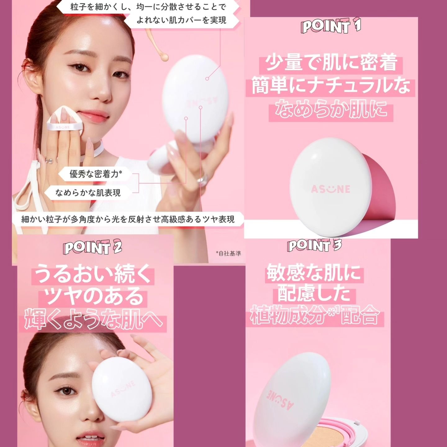 - ASUNEの新商品「デューイーメッシュファンデーション」は軽い付け心地で肌に密着し、ひと塗りで簡単にツヤめく肌を演出。 保湿成分*配合で、1日中みずみずしいフレッシュな肌に仕立てるメッシュタイプのファンデーションです。 *ナイアシンアミド、アデノシン(すべて保湿成分) ♦少量で肌に密着、簡単にナチュラルななめらか肌に 柔らかくて細かい『ミニマルジョンフォーミュラ』が肌の上に均一に分散され肌への密着力アップ。 軽い付け心地でナチュラルなのに、よれにくいなめらかな肌表現を実現。 ♦うるおい続くツヤのある輝くような肌へ 保湿成分*¹が肌に水分を与え、乾燥による化粧崩れを防止し、1日中ふっくらとしたツヤめく肌に。 ツヤあふれる肌が顔全体に透明感*²を与え、光輝く明るい印象*²に仕上げます。 *¹ナイアシンアミド、アデノシン(すべて保湿成分) *²うるおいによって肌に明るい印象をもたらすこと ♦敏感な肌に配慮した植物成分*¹配合 敏感な肌や肌荒れ*²に配慮したバンブーウォーター*¹配合。 肌の奥*³まで植物成分*¹を届けながら外部刺激*⁴から肌を守ることで、肌荒れ*²に配慮したベースメイクを実現。 *¹ダイサンチクエキス(整肌成分) *²乾燥などによる *³角質層 *⁴紫外線や乾燥など ♦テクスチャー 軽い付け心地でスッと肌に馴染みナチュラルなツヤ感を演出。みずみずしいフレッシュな肌に仕立てます。 【使用方法】 1.専用パフを軽くクッションに押しあてて、ファンデーションを適量とります。 2.顔の内側から外側に向かって、トントンとタッピングしながらつけていきます。 3.小鼻や目の際など細かな部分はパフを半分に折って肌に密着させてください。 【こんな方におすすめ】 軽い付け心地が好きな方/ツヤ肌に仕上げたい方/乾燥が気になる方/敏感肌の方* *乾燥などによる 【主要成分】 〈ダイサンチクエキス*¹〉 外的刺激*²を受けた敏感な肌をすこやかに保ちます。 *¹整肌成分 *²紫外線や乾燥など 〈アデノシン(保湿成分)〉 肌へスッと浸透*¹し、保湿とエイジングケア*²をサポートしハリのあるうるおった肌に仕上げます。 *¹角質層まで *²年齢に応じたお手入れ 〈ナイアシンアミド(保湿成分)〉 肌をすこやかに整え、うるおいをチャージしてくれるナイアシンアミド*¹が 明るく*²しっとりとしたなめらかな肌に整えます。 *¹保湿成分 *²うるおいによって肌に明るい印象をもたらすこと