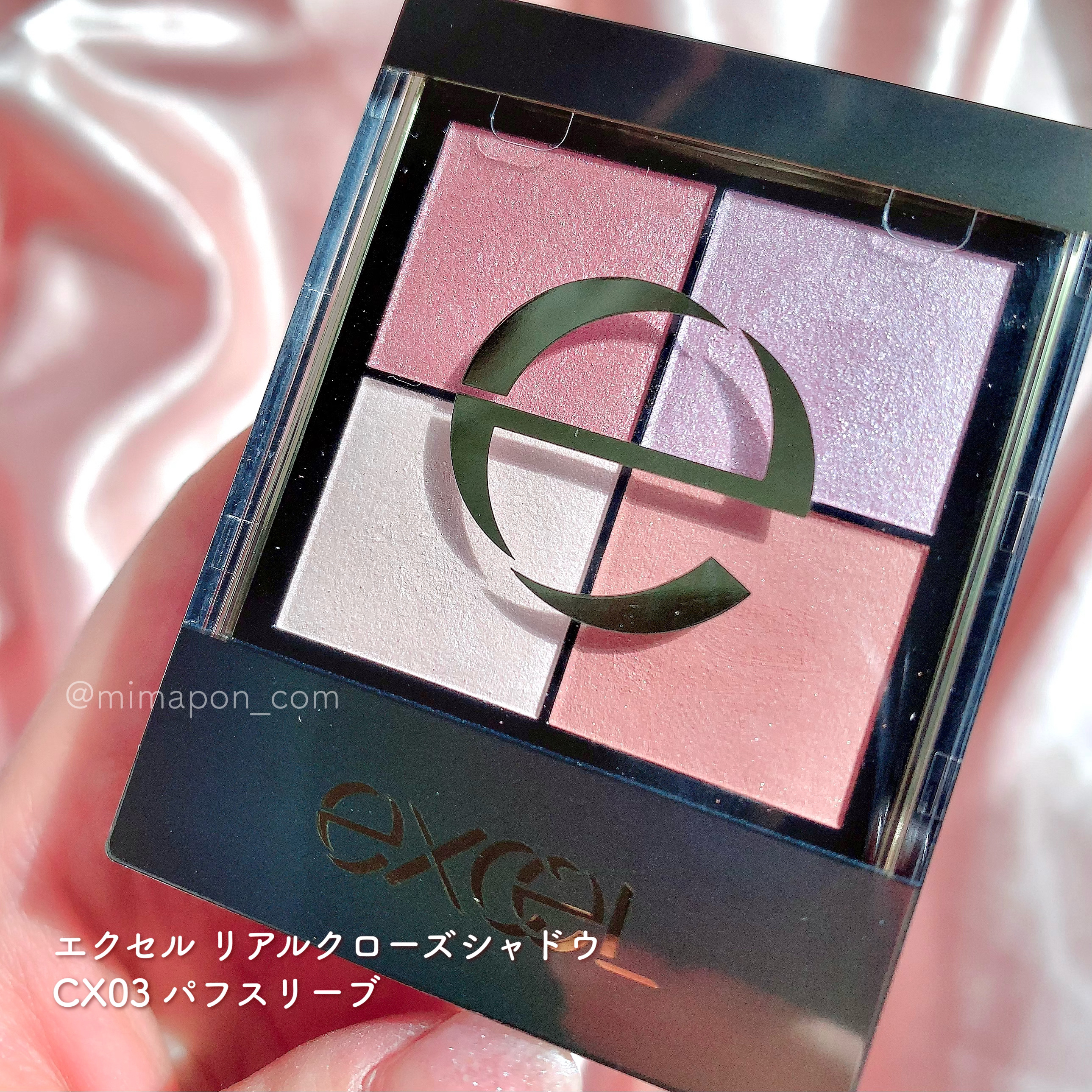 【可憐さを纏う】excelリアルクローズシャドウCX03 パフスリーブこれはブルベさん優勝✨🌱品のあるモーヴピンクパッと見ただけでは分からないツヤとラメの綺麗さ。ピンク色の可愛さ♡右下のブラウンも柔らかな青みブラウンで透明感たっぷりの配色。🌱...