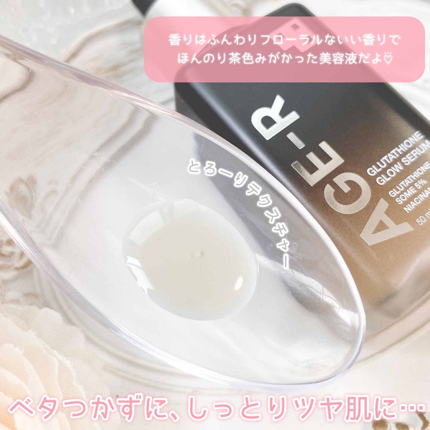 - 高純度99.4%のグルタチオン*を配合し、ハリツヤ肌に導く美容液です。 肌に馴染みやすいリン脂質製のカプセルにグルタチオン成分*を閉じ込め、肌の角質層までうるおいで満たします。 ☑グルタチオンソーム*:50,000ppm ☑ナイアシンアミド* 5%配合 ☑べたつかずしっとりツヤ肌 ☑美顔器AGE-R スキンブースターショットと一緒に使えます 化粧水などでお肌を整えたあと、適量を取り、お肌のキメに沿ってまんべんなく塗った後、やさしくなじませます。 *保湿成分 ■お肌に異常が生じていないかよく注意してご使用ください。化粧品がお肌に合わないとき即ち次のような場合には、使用を中止してください。そのまま使 用を続けますと、症状を悪化させることがありますので、皮膚科専門医等にご相談されることをおすすめします。また、傷やはれもの、しっしん等の異常が ある部位には、ご使用にならないでください。 (1)使用中、赤味、はれ、かゆみ、刺激、色抜け(白斑等)や黒ずみ等の異常があらわれた場合 (2)使用したお肌に、直射日光があたって上記のような異常があらわれた場合 ■目に入らないようご注意ください。目に入ったときは、こすらずにすぐに洗い流してください。その後、目に異物感など異常が残る場合は、眼科専門医へ ご相談されることをおすすめします。 ■極端に高温又は低温の場所、直射日光のあたる場所には保管しないでください。 ■開封後なるべく早めに使用してください。 ■ご使用後はフタをきちんと閉めてください。 ■乳児、子供の手の届かない所に保管してください。