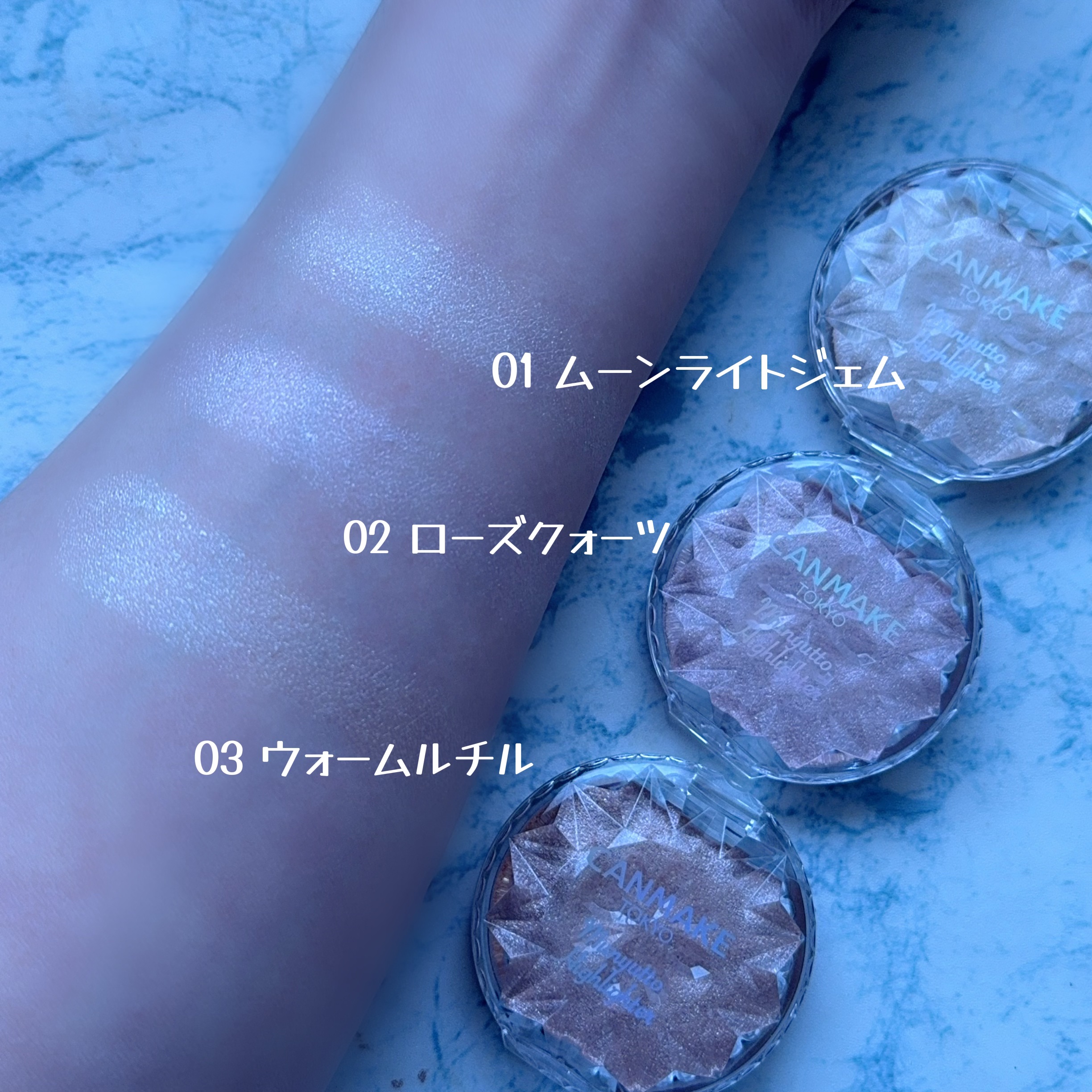 - <01 ムーンライトジェム> トリエチルヘキサノイン、合成フルオロフロゴパイト、ジメチコン、リンゴ酸ジイソステアリル、(ジメチコン/ビニルジメチコン)クロスポリマー、シリカ、スクワラン、オリーブ果実油、セラミドNP、ホホバ種子油、カニナバラ果実油、パルミチン酸レチノール、ツボクサ葉エキス、BG、マイクロクリスタリンワックス、パラフィン、トコフェロール、フェノキシエタノール、メチルパラベン、ジパルミチン酸アスコルビル、酸化チタン、酸化鉄、水酸化Al、酸化スズ <02 ローズクォーツ> トリエチルヘキサノイン、合成フルオロフロゴパイト、ジメチコン、リンゴ酸ジイソステアリル、(ジメチコン/ビニルジメチコン)クロスポリマー、シリカ、スクワラン、オリーブ果実油、セラミドNP、ホホバ種子油、カニナバラ果実油、パルミチン酸レチノール、ツボクサ葉エキス、BG、マイクロクリスタリンワックス、パラフィン、トコフェロール、フェノキシエタノール、メチルパラベン、ジパルミチン酸アスコルビル、マイカ、酸化チタン、酸化鉄、赤202、水酸化Al、酸化スズ <03 ウォームルチル> トリエチルヘキサノイン、ジメチコン、合成フルオロフロゴパイト、リンゴ酸ジイソステアリル、(ジメチコン/ビニルジメチコン)クロスポリマー、シリカ、スクワラン、オリーブ果実油、セラミドNP、ホホバ種子油、カニナバラ果実油、パルミチン酸レチノール、ツボクサ葉エキス、BG、マイクロクリスタリンワックス、パラフィン、トコフェロール、フェノキシエタノール、メチルパラベン、ジパルミチン酸アスコルビル、マイカ、酸化チタン、酸化鉄、水酸化Al、酸化スズ <04 ブルートパーズ> トリエチルヘキサノイン、ジメチコン、合成フルオロフロゴパイト、リンゴ酸ジイソステアリル、(ジメチコン/ビニルジメチコン)クロスポリマー、シリカ、スクワラン、オリーブ果実油、セラミドNP、ホホバ種子油、カニナバラ果実油、パルミチン酸レチノール、ツボクサ葉エキス、BG、マイクロクリスタリンワックス、パラフィン、トコフェロール、フェノキシエタノール、メチルパラベン、ジパルミチン酸アスコルビル、マイカ、酸化チタン、コンジョウ、グンジョウ、水酸化Al、酸化スズ