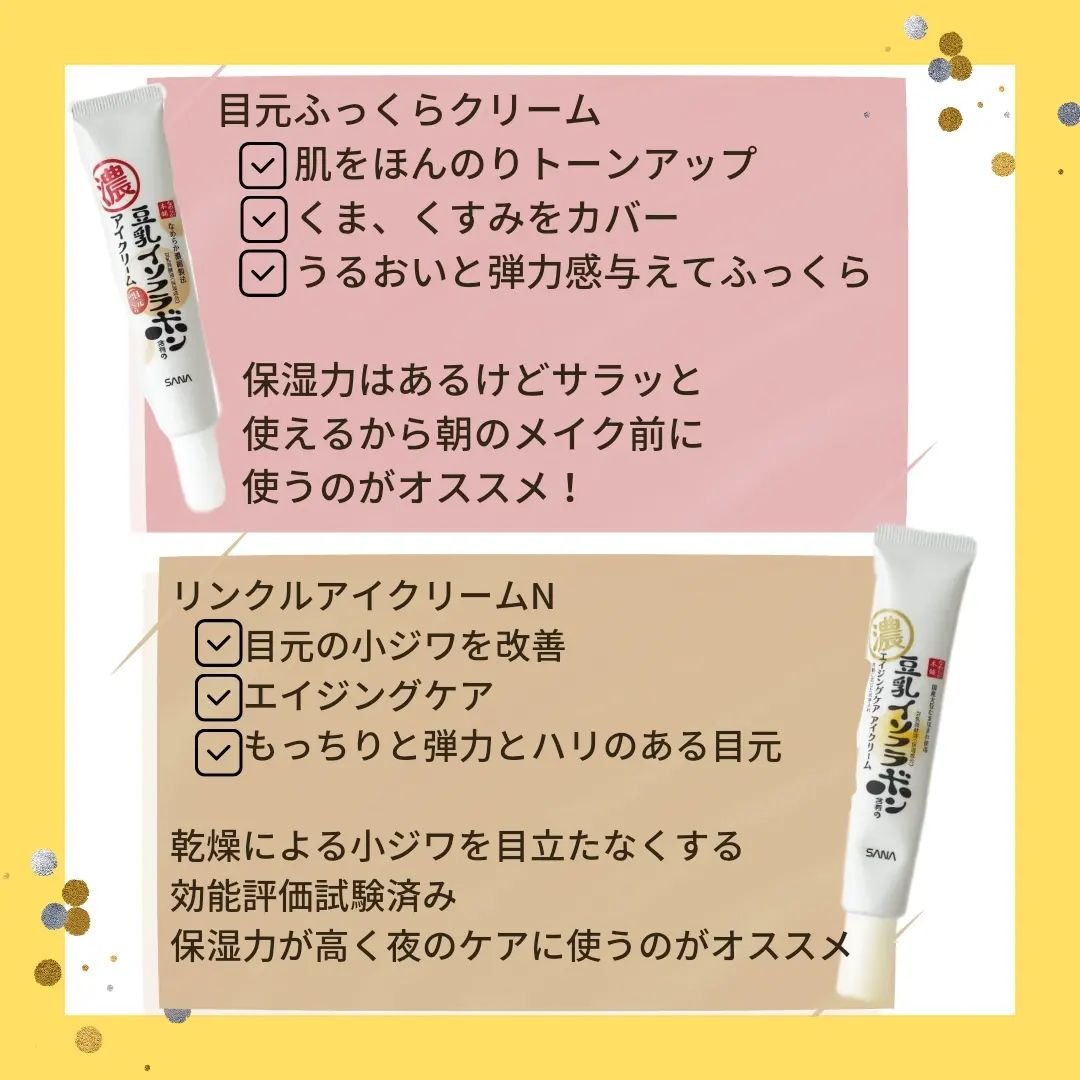 豆乳イソフラボンアイクリームなめらか本舗リンクルアイクリームN目元ふっくらクリームNC今回新しくピュアレチノール入りのアイクリームを購入したので元々持っていたのと比較してみました✨よろしければご参考にしてください...