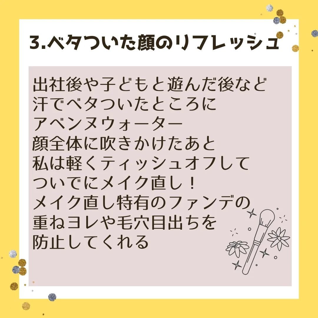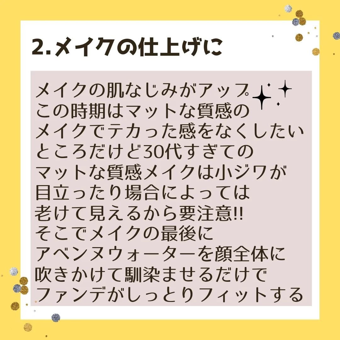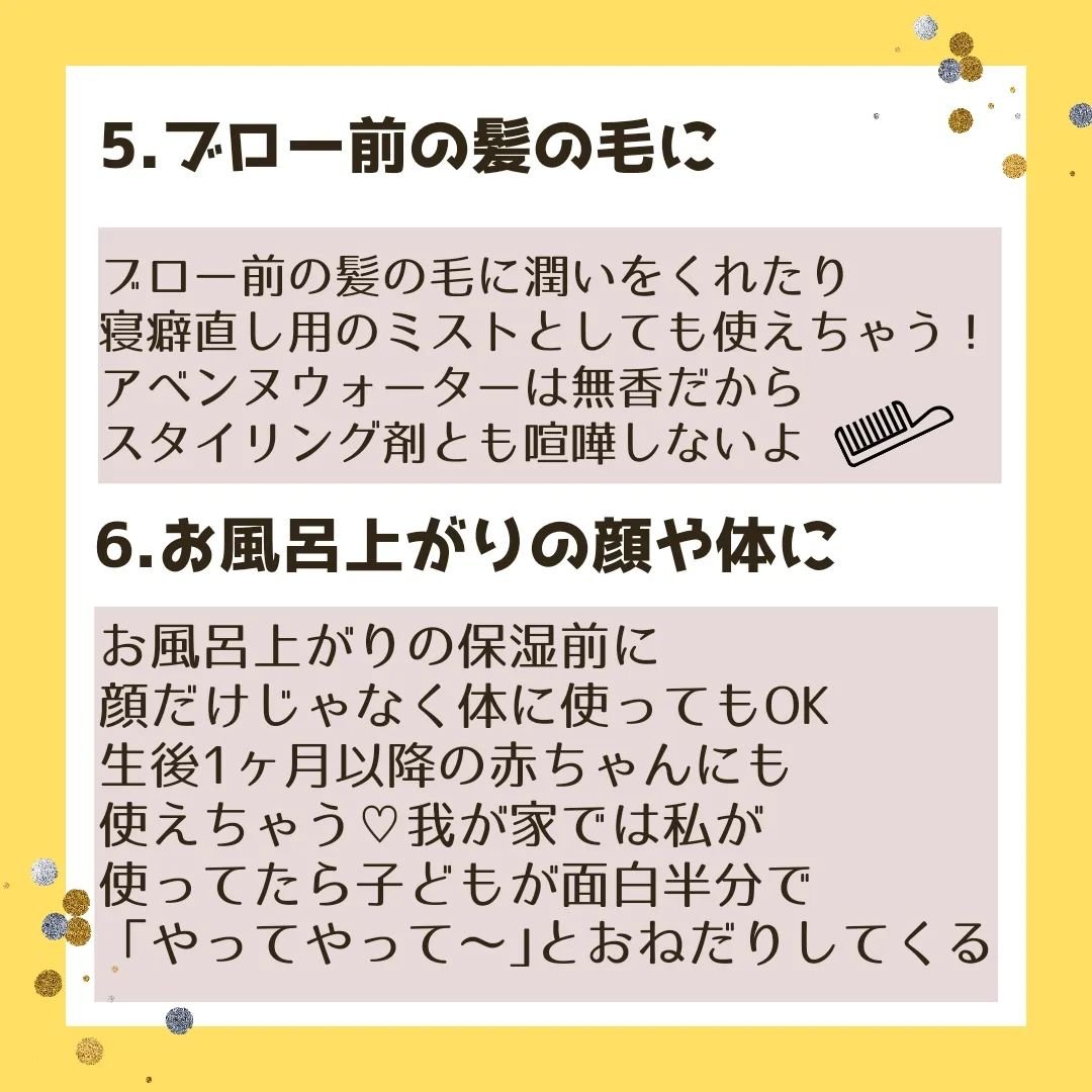- 肌にいい水、アベンヌ温泉水100%。 肌をやわらげ、みずみずしくなめらかにし、敏感な肌をやさしく落ちつかせます。 使いやすいスプレータイプの化粧水。 ~こんなとき、こんな方におすすめ~ ●洗顔後・毎日のお手入れに ●敏感肌をはじめ肌あれ・乾燥肌~オイリー肌など、すべての肌タイプ ●化粧水の前に、プレ化粧水として ●年齢性別を問わずすべての方に ●赤ちゃん(生後3ヵ月~)のデリケートな肌のお手入れに ●外出や旅先でのお手入れに ●乾燥しがちな機内やホテルでの水分補給に ●脱毛・脱色後のデリケートな肌に 無菌室製造/無香料/無着色/アルコール(エタノール)フリー/防腐剤フリー/アレルギーテスト・パッチテスト・ノンコメドジェニックテスト済み ※すべての方にアレルギーや皮ふ刺激がおきない、また、ニキビができないわけではありません。 ※2024年9月より順次パッケージリニューアル